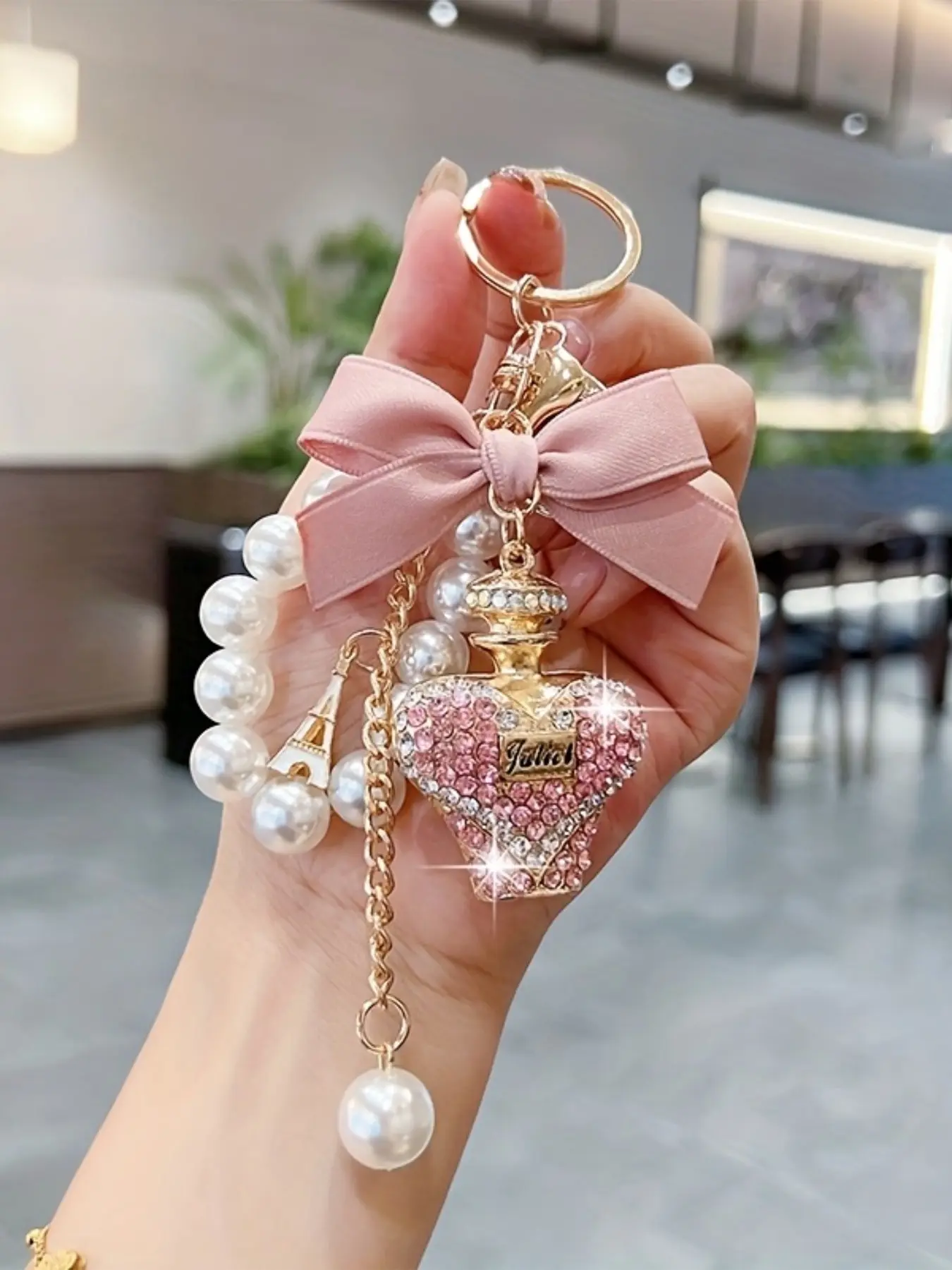 Creative Water Bottle Keychain, Fashion Bow Perfume Bottle Bag Charm, Elegant Pearl Chain Car Key Ring Gift Accessory