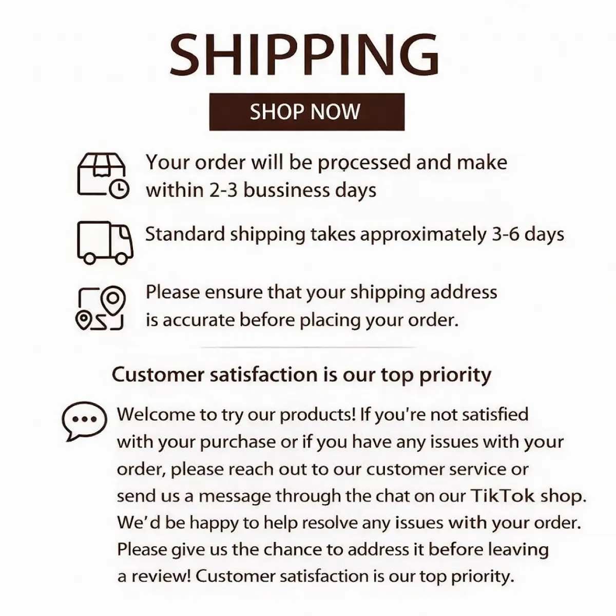 • Processing time:1–2 business days • Standard shipping:3–6 business days