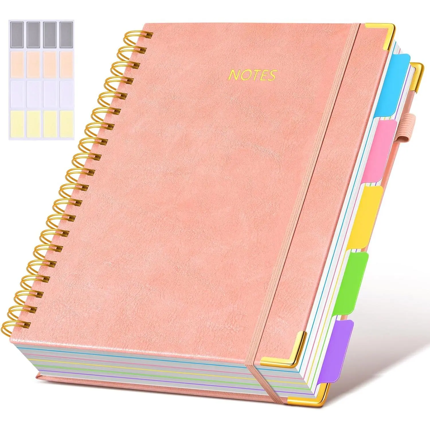 [Leather Hardcover Spiral Notebook]Premium leather combine cardboard constituted a sturdy waterproof cover, prevent coffee,water from wetting the inner pages and against the notebook tabs /pages from bending, while 4 golden metal-corners and thick twin- spiral binding, further protect your important meeting records or work school note well. A kind side pen loop design, which reduce the frequency that losing pens. [5 Adjustable Dividers with 8 Tabs]Our 5 subject notebook include 5 removable plastic dividers, flexible and durable so you can move and organize them as your. It can be divided into 5 sections in total, which had enough features to keep organized on different subjects, instead of piles of random spiral notebooks that will slimmed your backpack down a ton! Come with 8 self-adhesive labels that separate information and make it easy to find categories to help organize your notes effectively. [300 Pages Thick Notebook]Large B5 size notebook 8"x10" with 300 pages /150 sheet for long-term storage will reduce the amount of notebooks you buy! Acid-free light Ivory paper that protect your eyes. High-quality 100GSM thick page create smoother writing process and prevent ink bleeding through or ghosting. 7. 1mm college ruled spiral notebook and the top of each page are sections for"Weather","Week","Memo No" and "Date" to meet your daily note writing needs. [Easy Writing at 180 ° Lay Flat]Thick twin-spiral binding less likely to fall apart and easy to turn the pages to ensures that the notebook lays flat when open,making writing a breeze even for left handed writers. Elastic closure band keep your spiral journal secure when closed and can also be used as a bookmark to keep track where you wrote. An expandable back pocket that is for storing extra notes, cards, or other important items. [Hardcover Notebooks for Work School]This spiral 5 subject notebooks is an excellent choice for students, professionals, or anyone who like to write things down and needs to keep them organized. A stylish look with gold color stamp font, binding brighten up your dreary desk, also a wonderful gift to work organization, back to school or family records.