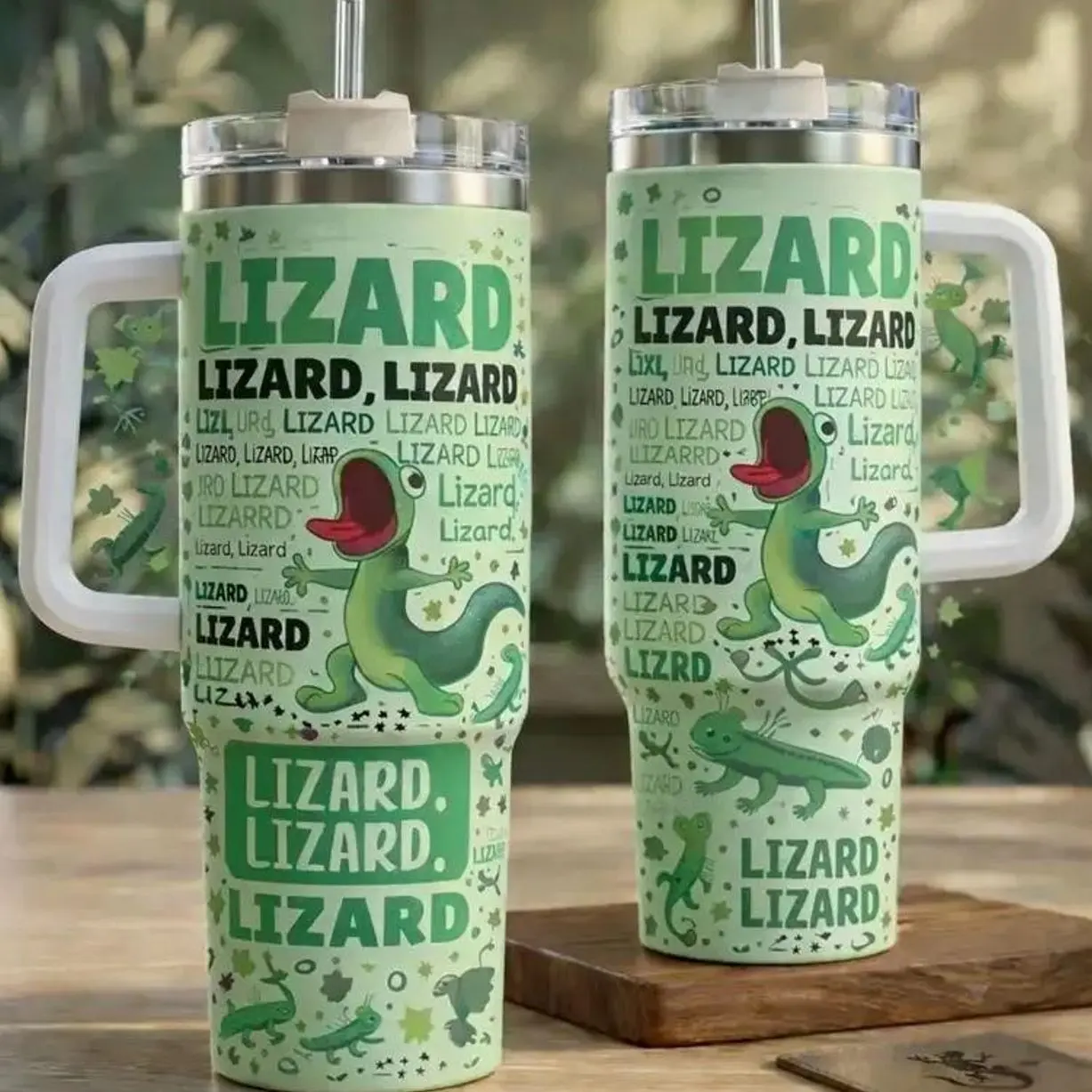 Funny Lizard Doodle Pattern Tumbler 40oz Cute Green Gecko Cartoon Reptile Lover Gift Cup With Handle And Straw