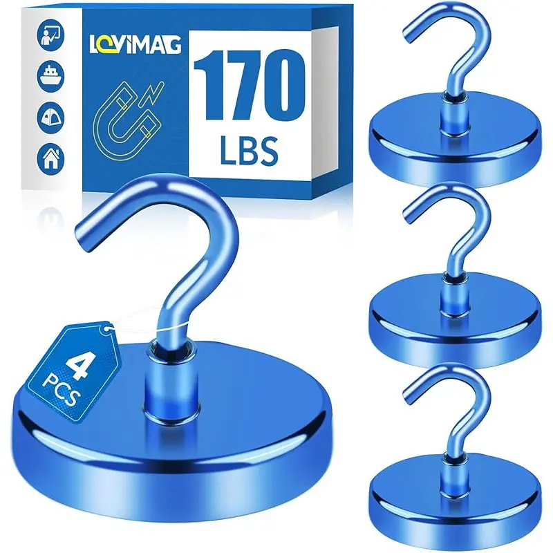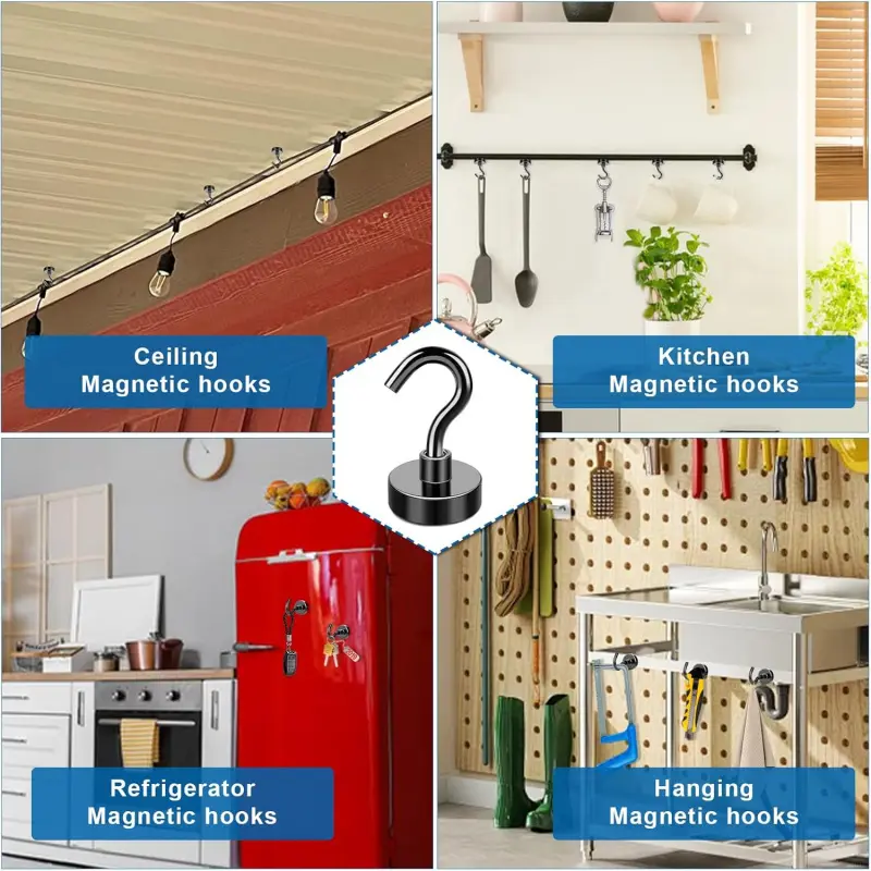 [BEARABLE TRACTION]--- 30 lbs tension of black magnetic hook is based on the direction of tension perpendicular to the contact surface -- reduced by 2/3 if used horizontally. Please note that the tension of the magnetic hook is also affected by the direction, the material of the contact surface and other factors. [SUPERIOR MAGNETS COATED]--- Black magnetic hooks are coated with three layers of Black epoxy+ Nickel+ Copper, which provides a shiny and rust resistant coated steel cup provides protection for the magnet and helps to prevent chipping or cracking. [HIGH QUALITY]--- The black magnetic hook is composed of neodymium magnet and high quality A3 steel. Due to the addition of an iron shell, the suction of magnetic hook is several times that of an ordinary magnet. Metal magnetic hook, strong magnetism forever! [VARIOUS USES]--- Magnetic hook is easy to install and use because of its simple structure.Metal magnetic hook is an ideal choice for hanging small objects in places with iron or steel, such as home, school, workshop, indoor and outdoor. [PROFESSIONAL SERVICE]--- We are a magnet supplier with professional strength.You can certainly find black magnetic hooks you want in my shop!If you need mass customization of magnetic hooks, contact us and we can meet your needs.