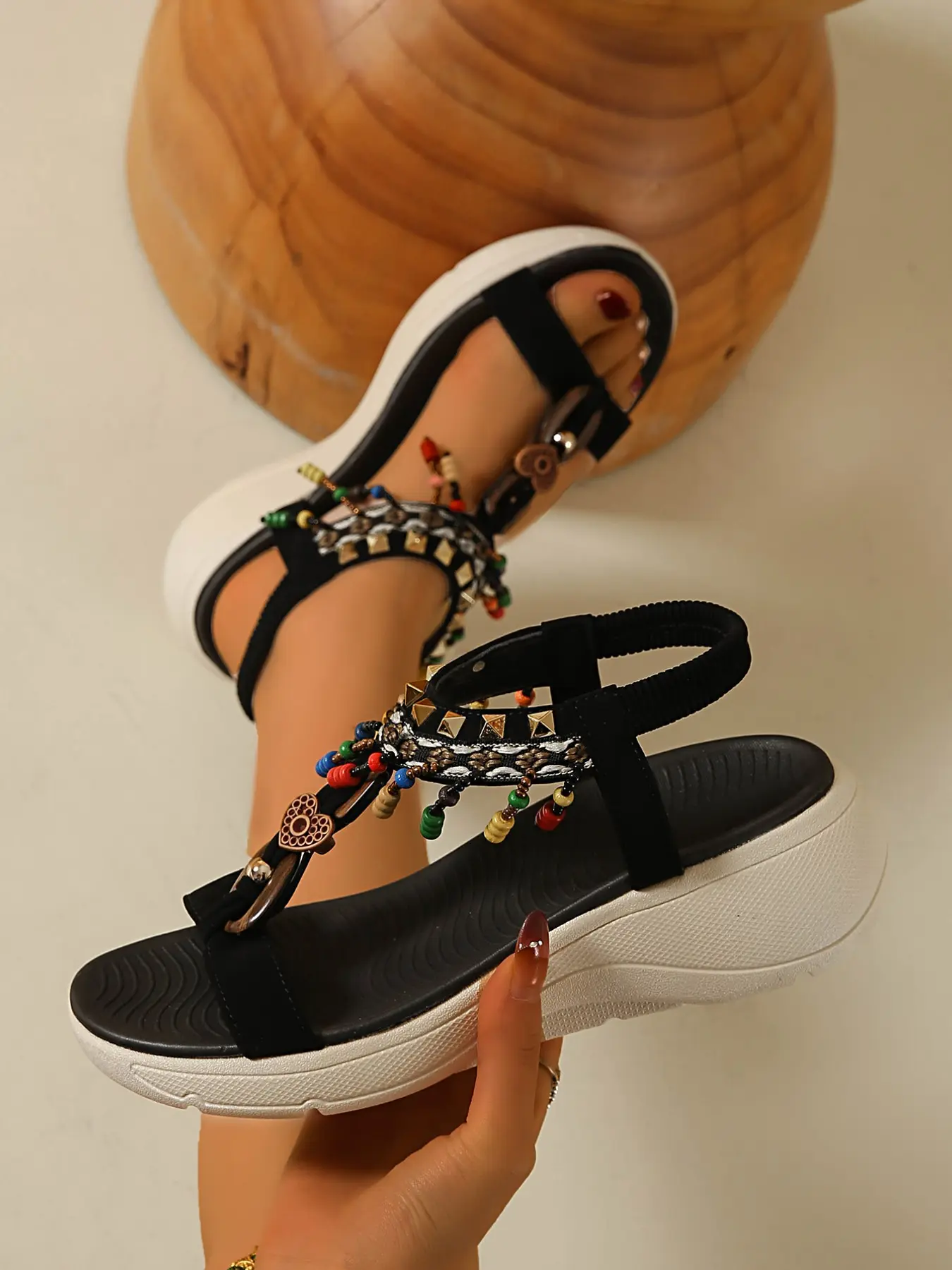 5. Women's New Boho Beaded Roman Sandals, Summer Thick Sole Heeled Beach Shoes, Artificial Leather, Rubber Sole, Less Than Ankle Height