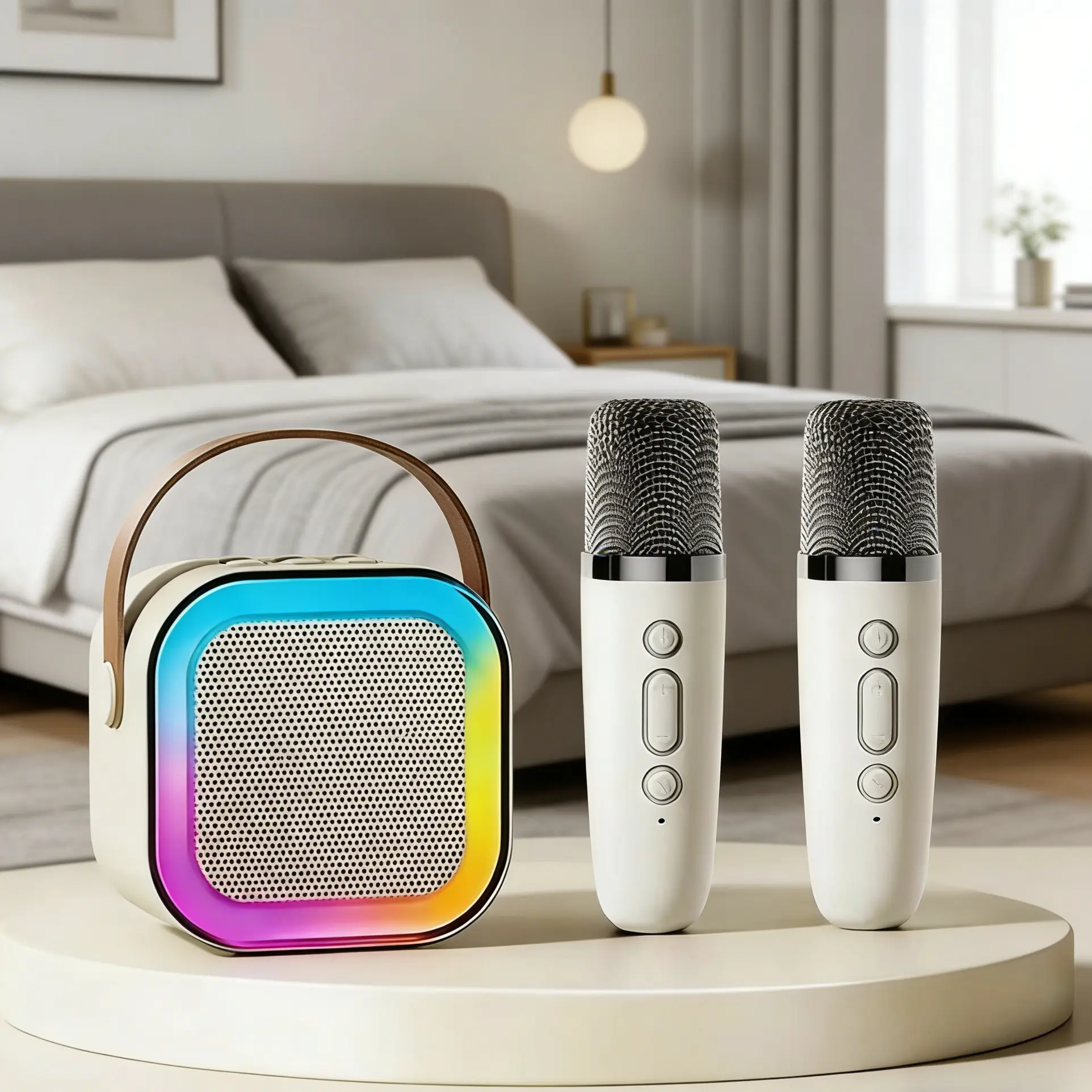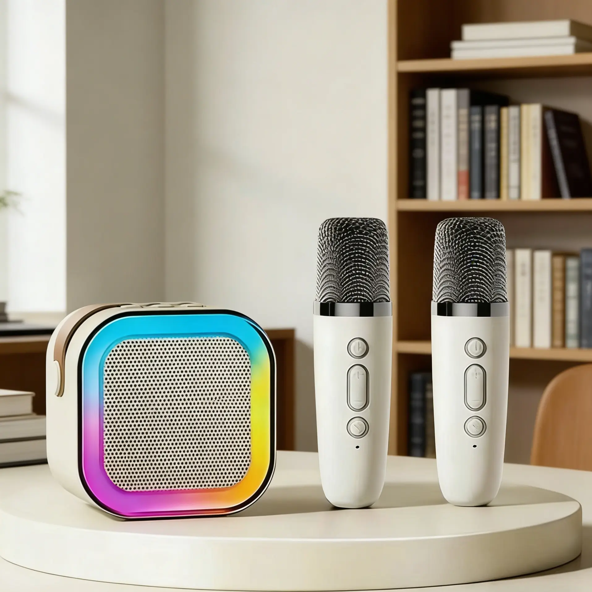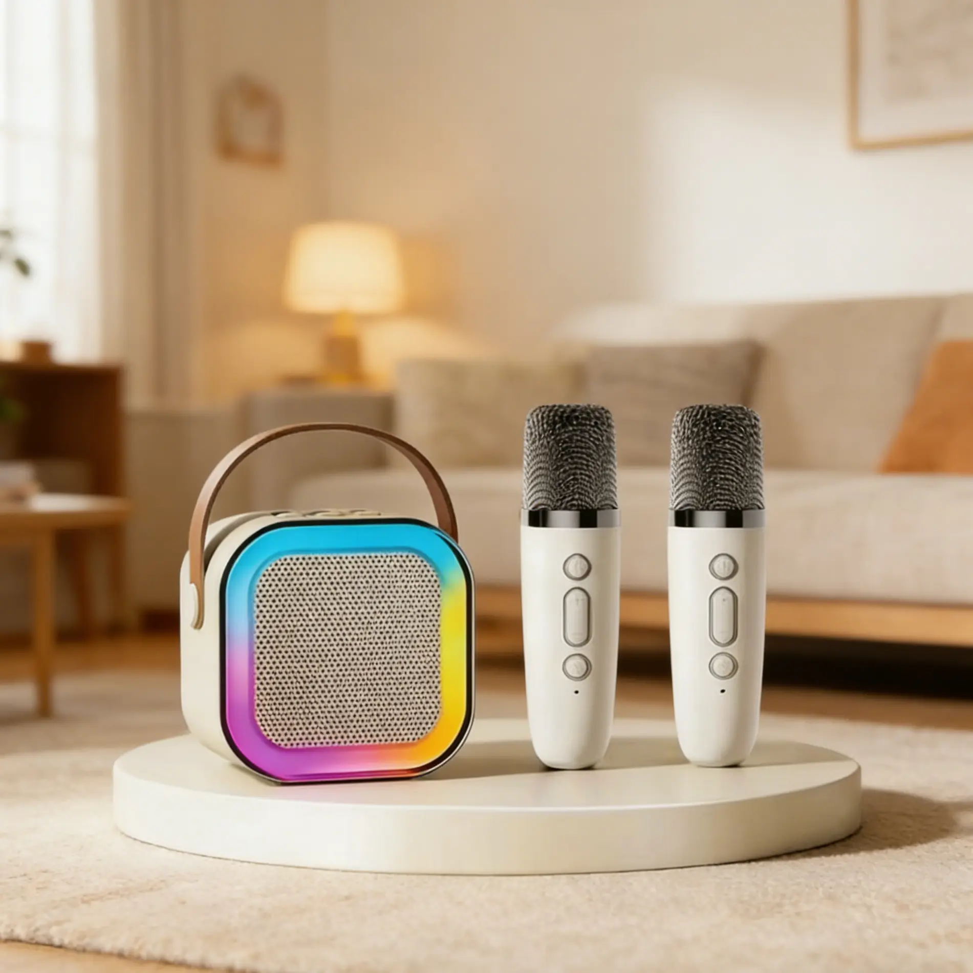Portable Bluetooth karaoke machine with 2 dual wireless microphones.