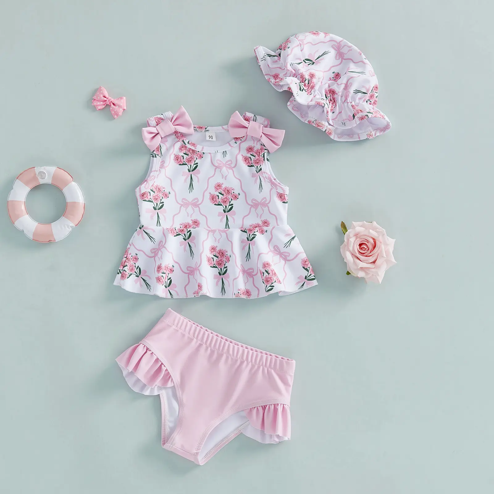 3Pcs Toddler Girl Swimsuit Set Sleeveless Crew Neck Floral Print Bow Decor Tops Bikini Bottoms and Hat Swimwear