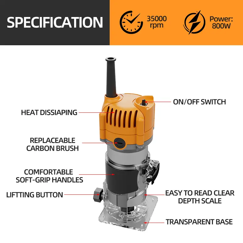 Hanwise Compact 800W Wood Router, Professional/ DIY Woodworking Tool For Slotting, Trimming, Edging, Carving - Dust Collection System, Transparent Base, Includes Guide Rail & Wrench, 110V US Plug, Ideal For Beginners & Pros, Woodworking Equipment