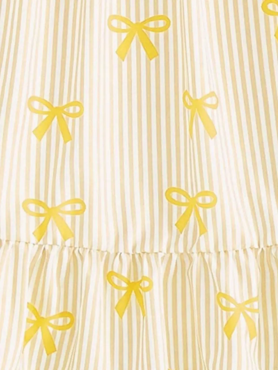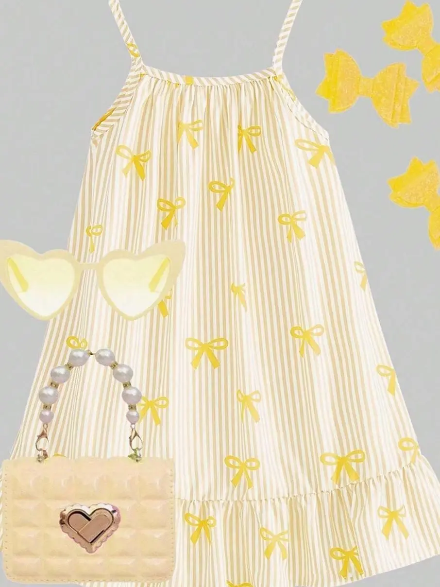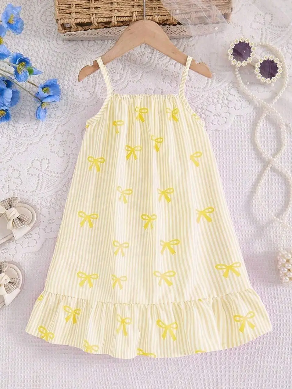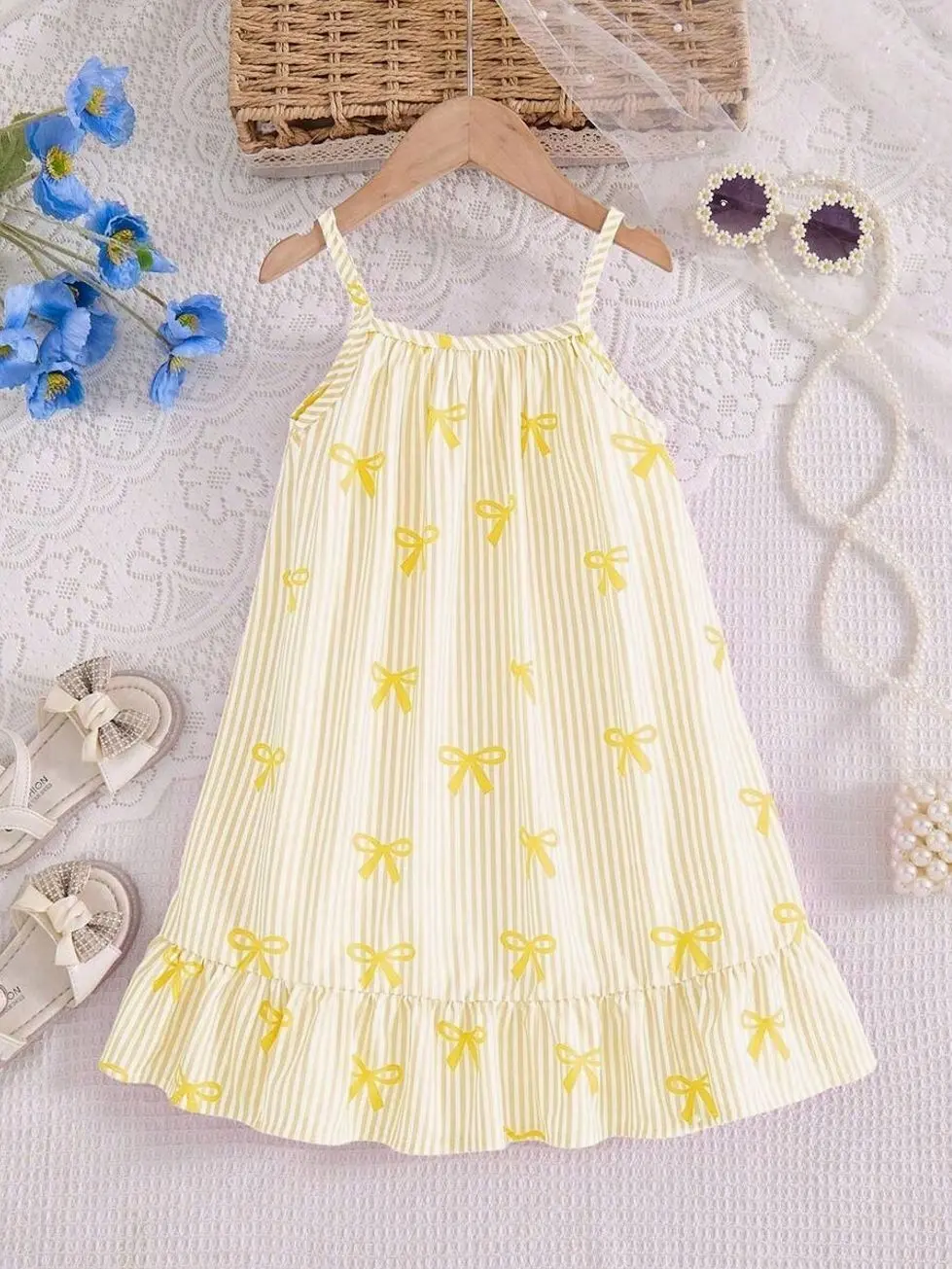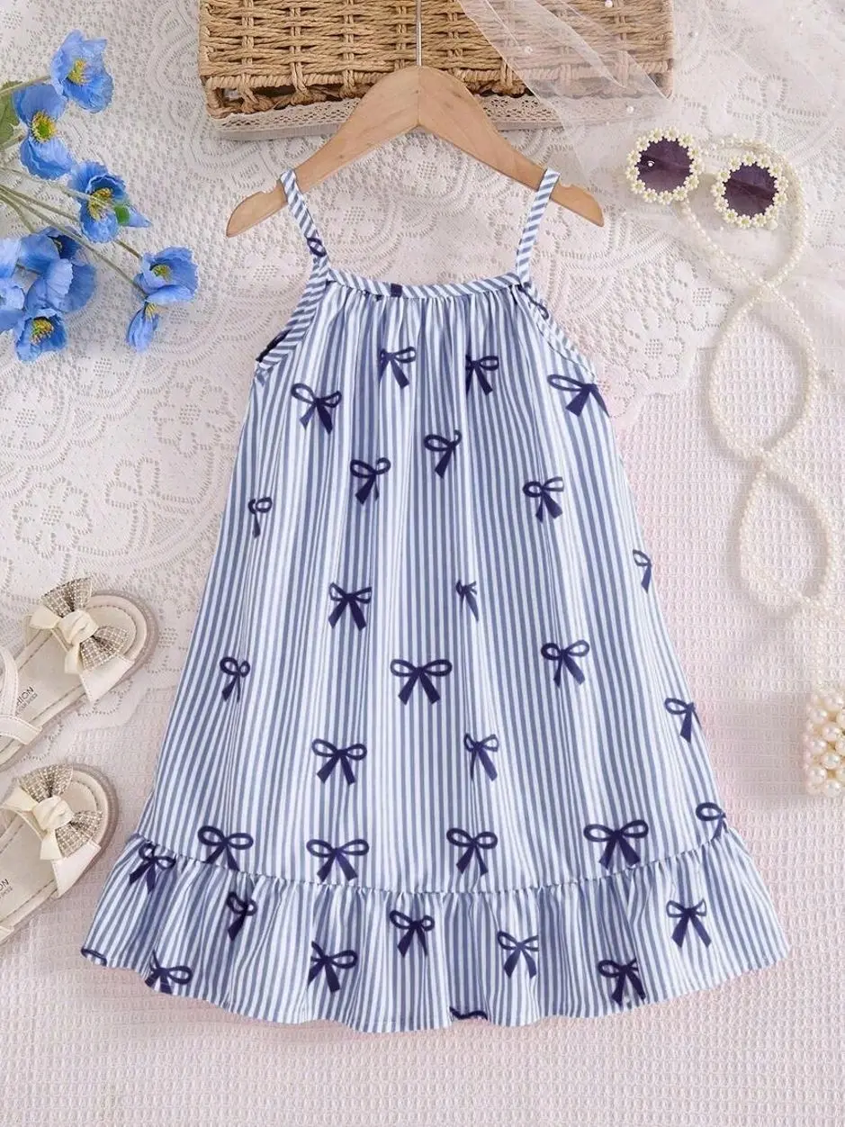 kids This Woven Fabric Sundress For Girls Features Striped Bows, Digital Prints, A Colorful Red Striped Hem, And Ruffles. It's Perfect For Everyday Summer Wear, Outings, Travel, Vacations, And Parties.