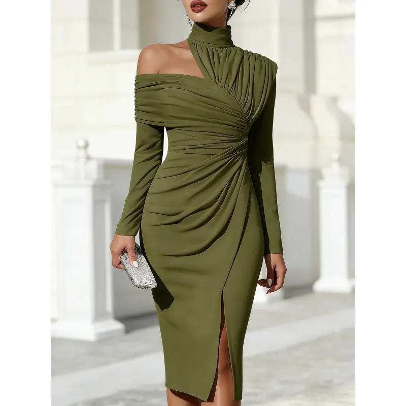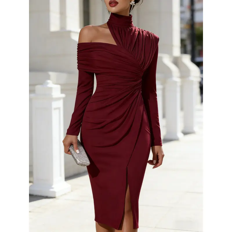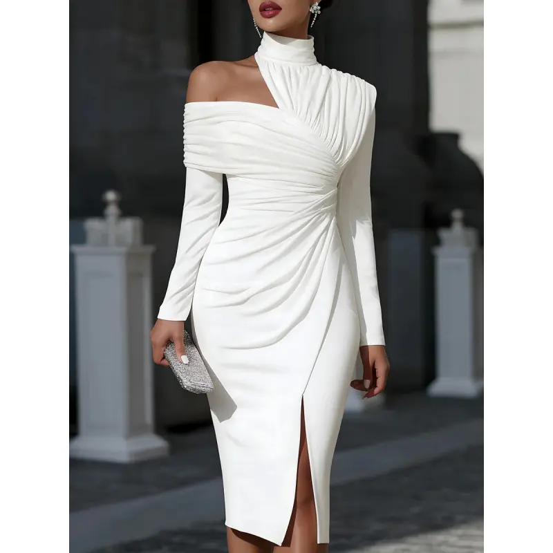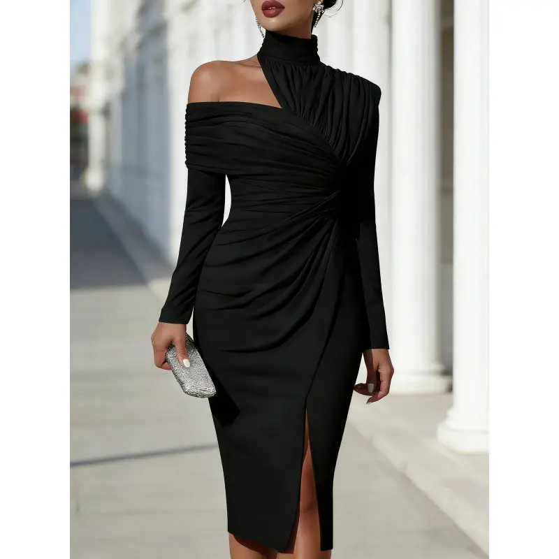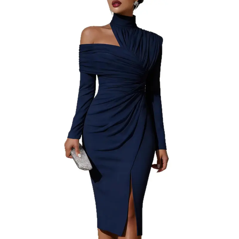 2026 Autumn New Women's Fashion Elegant Half-High Collar One-Shoulder Top with Hip-Hugging Pleated Irregular Skirt