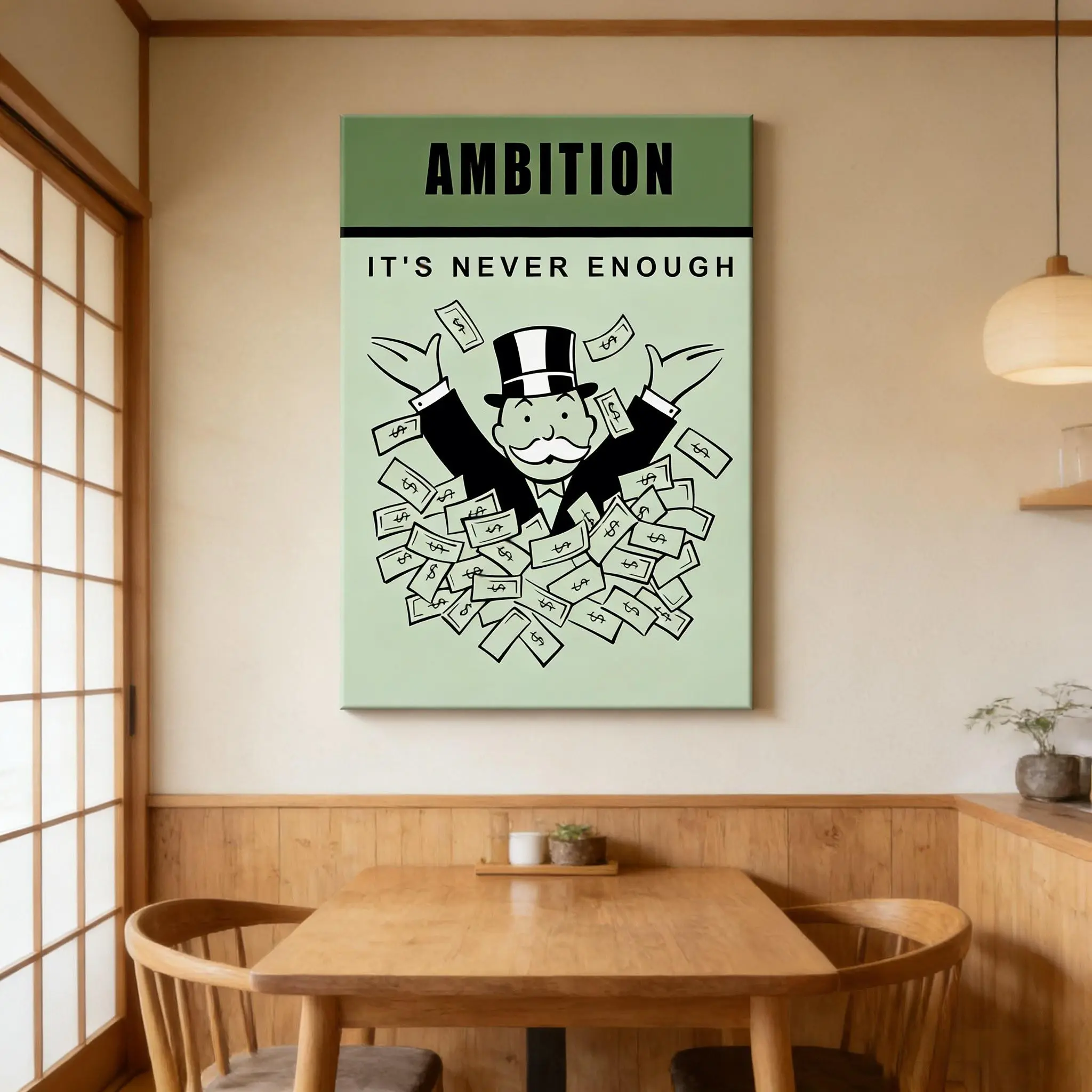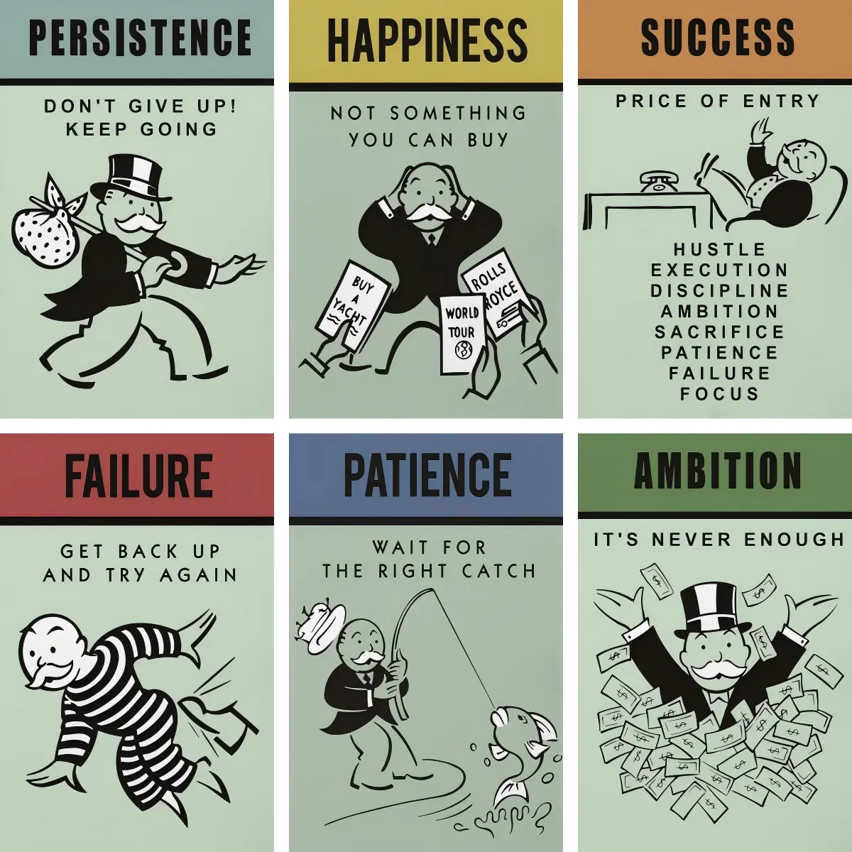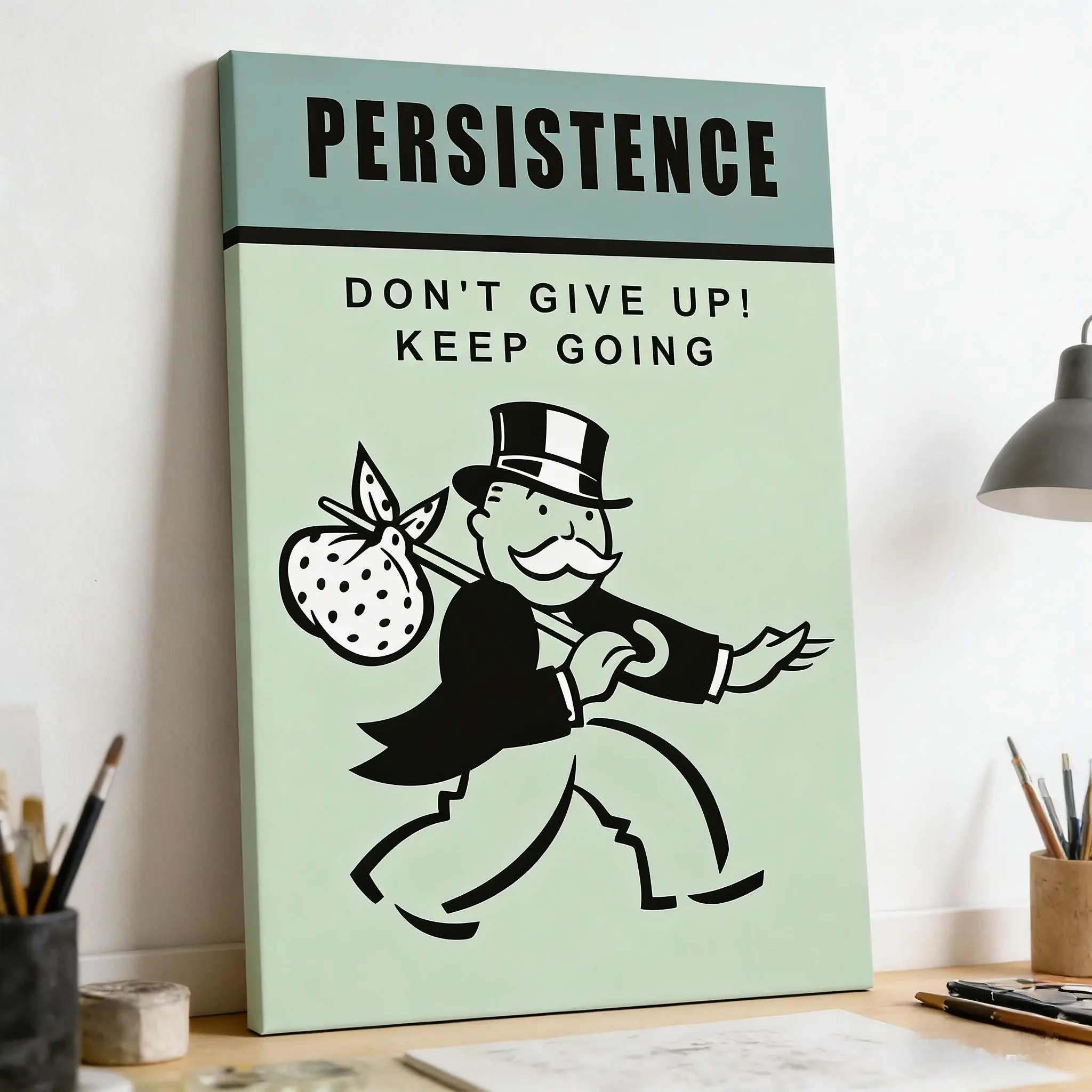 This Monopoly Inspirational Art Poster is perfect for your home office or living room. It features themes of success, happiness, patience, failure, ambition, and more. Ideal for wall decor, it adds a motivational touch to any room. Enhance your environment with this unique poster.