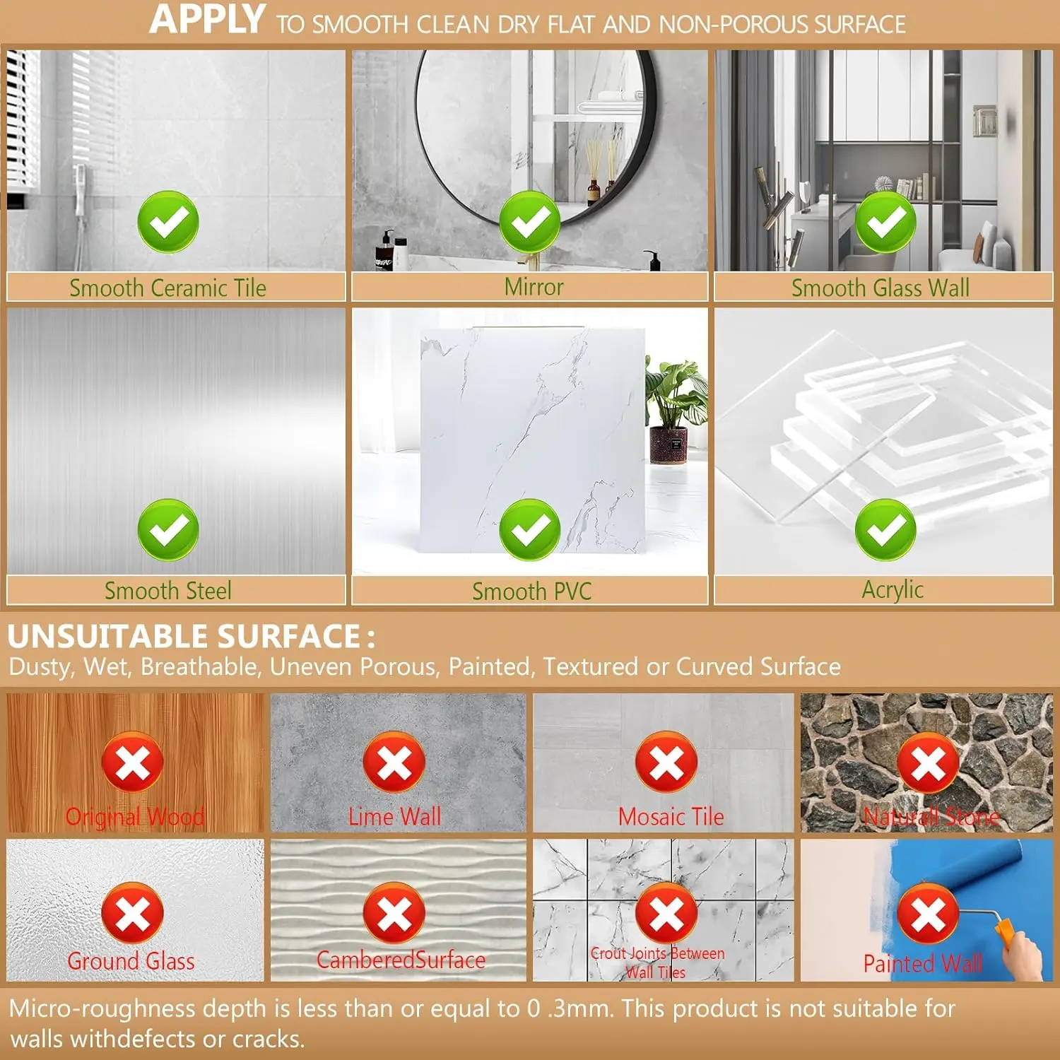 ·WARM TIPS: This wall mounted soap dish is best suited for smooth surfaces, such as glass, mirrors, polished metal, stainless steel, plastic sheets, acrylic, etc. Please do not stick it to grouting lines and porous surfaces, such as wallpaper, painted walls, wood, unfinished marble, natural stone (such as limestone)