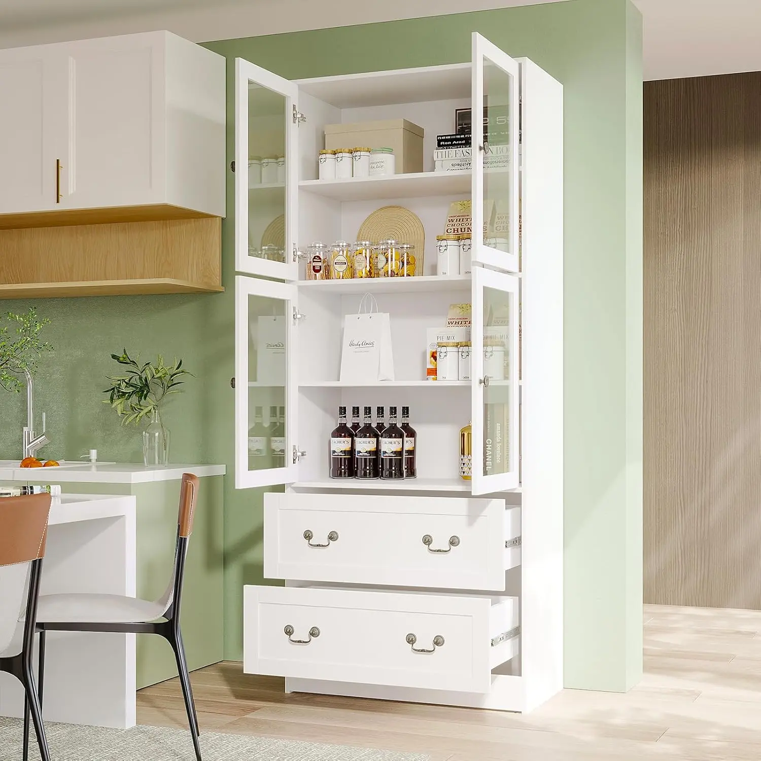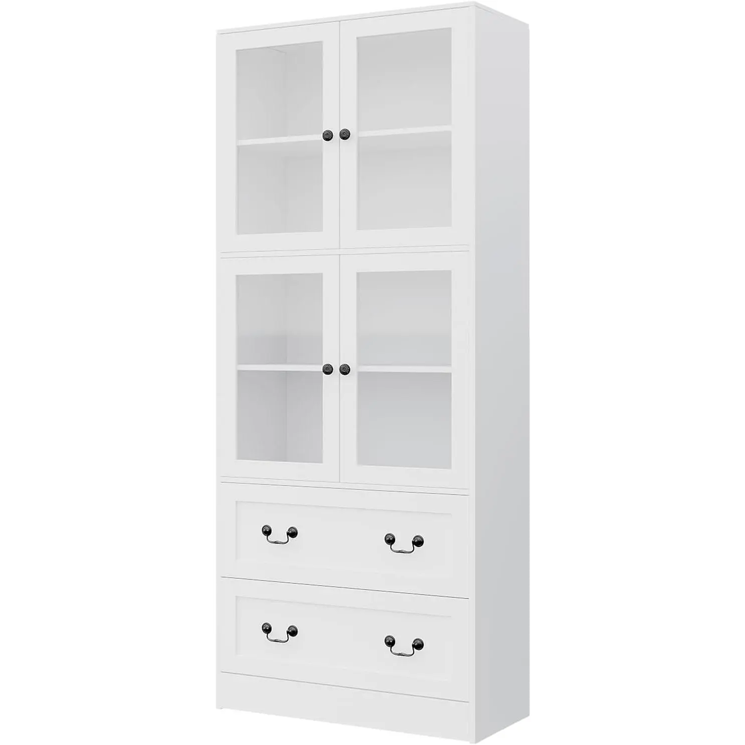 [Ample Storage Space]The bookcase has a total of 4 storage shelves and 2 drawers.The multi-layer design allows messy items to have their own place.Keep your tableware, books, display decorations and other personal items clear and easy to access while protecting your items from dust [Modern Design]This tall bookcase comes with 4 glass-framed doors, which is modern and stylish, enhancing the visual appeal;the solid wood board is matched with stylish bronze handles to show elegant charm.It matches perfectly with various decorations