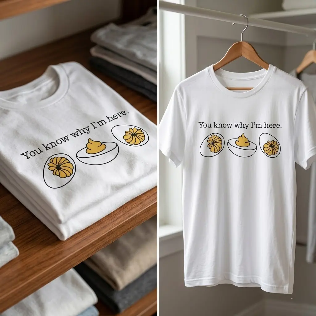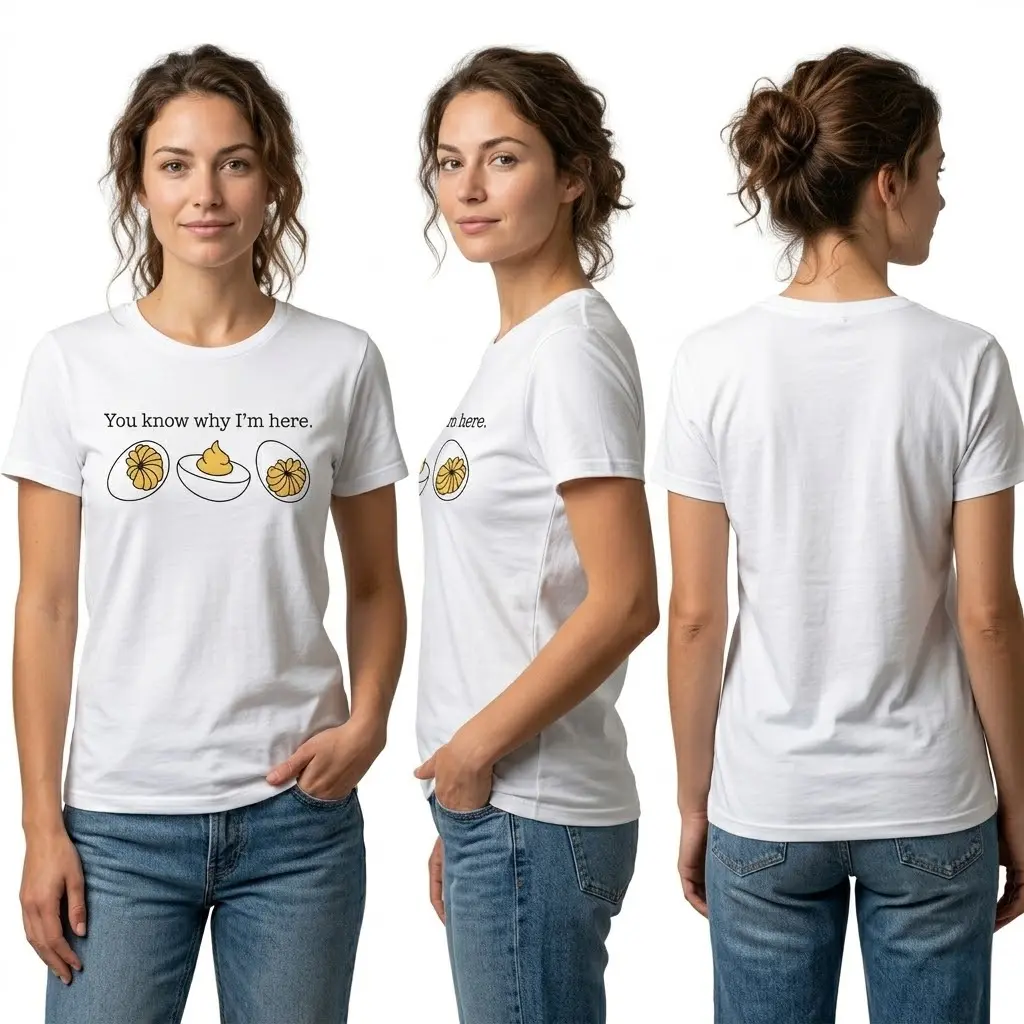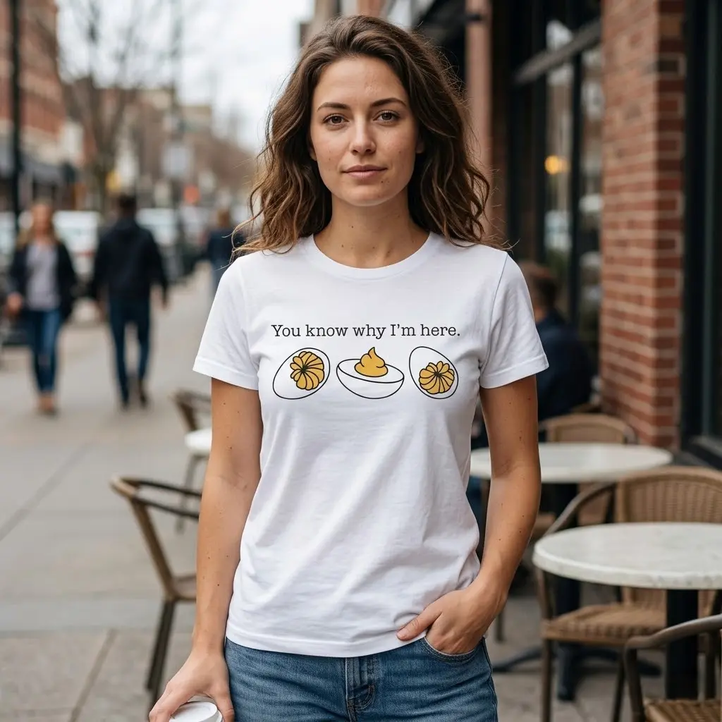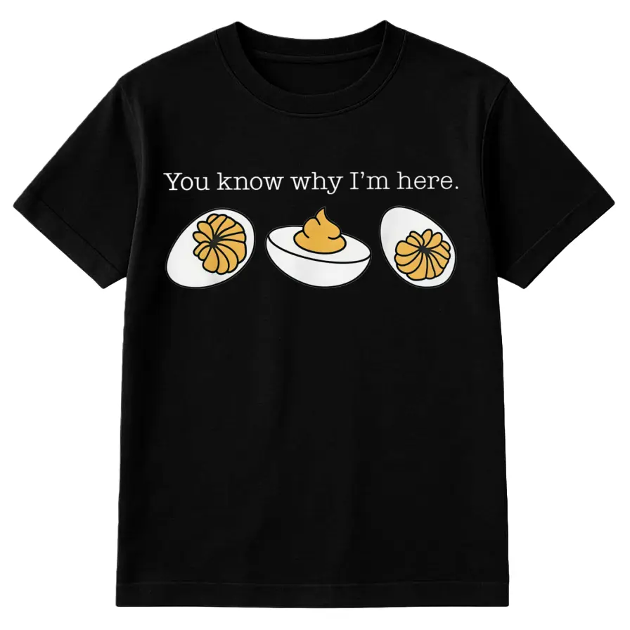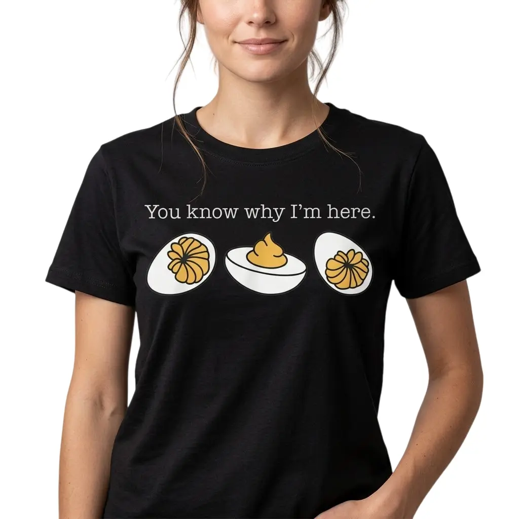 Retro Thanksgiving Dinner You Know Why I'm Here Deviled Egg T-Shirt Womenswear Cotton Classic Fit Crew Neck Short Sleeves