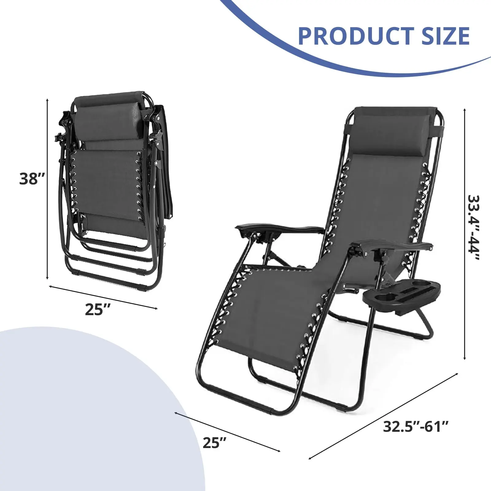 This set of two portable zero gravity chairs features a foldable design for easy transport and storage, weighing 15.43 lbs each. The lightweight chairs are suitable for outdoor use at the beach, camping, patio, poolside, garden, or backyard.