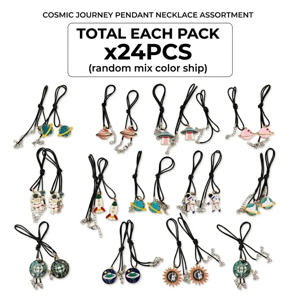 24pcs Space Theme Party Necklaces for Kids, Enamel Astronaut Planet Rocket Ufo Pendants, Galaxy Birthday Party Supplies, Boys Girls Gift Fillers