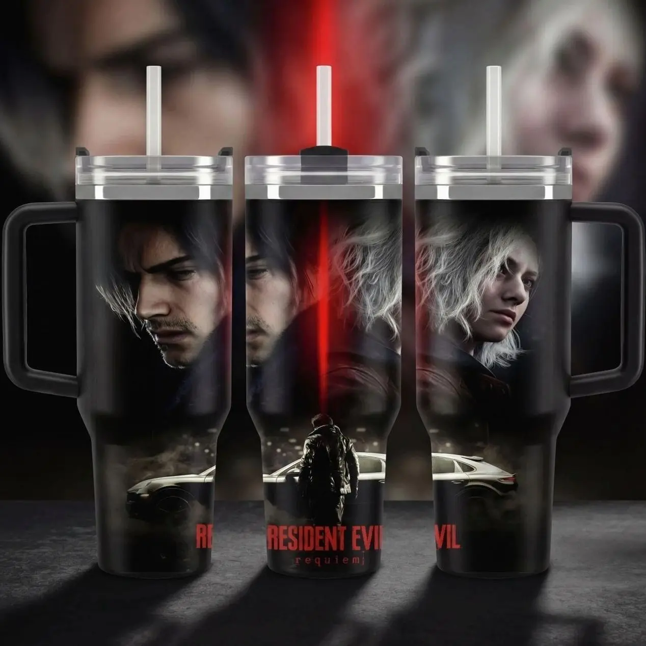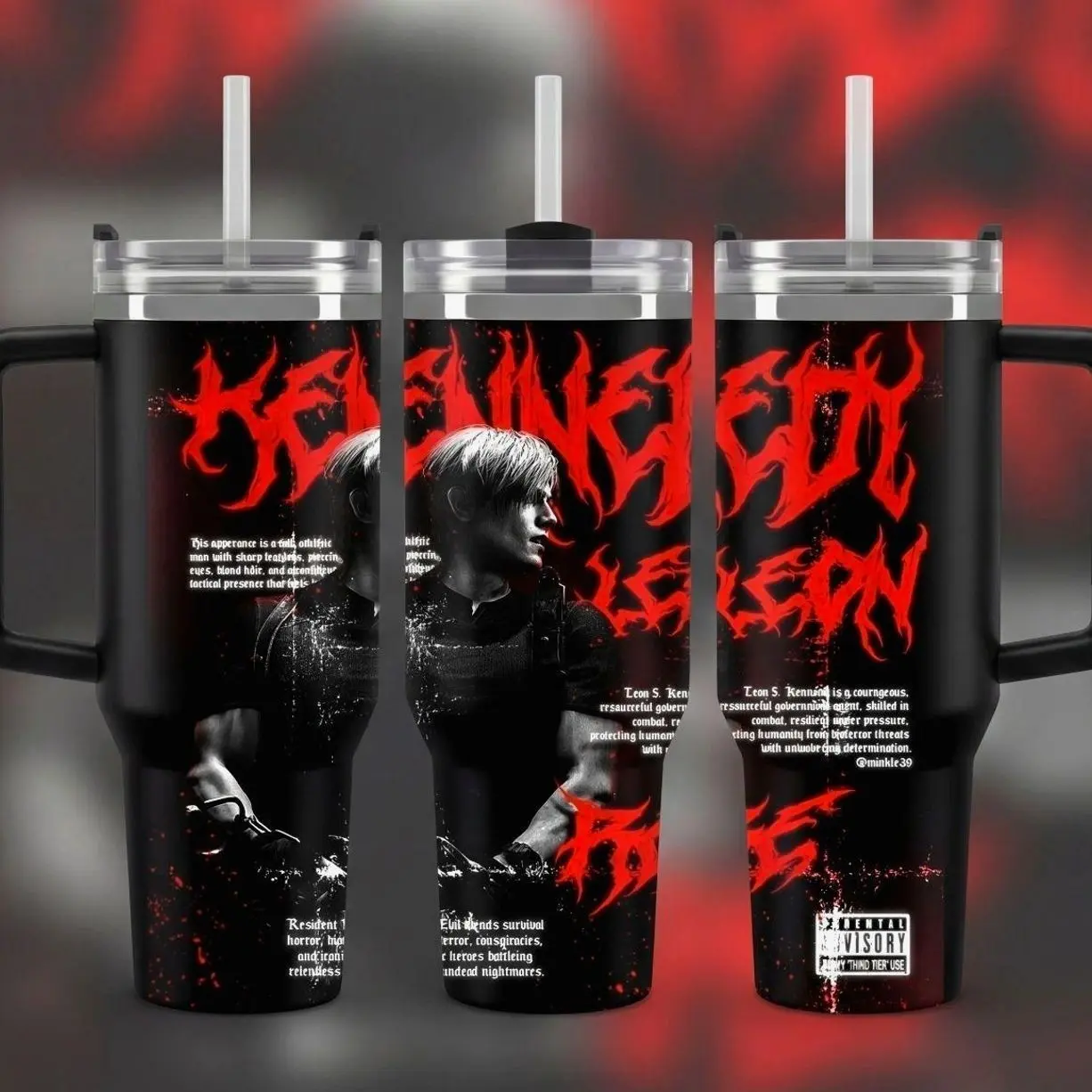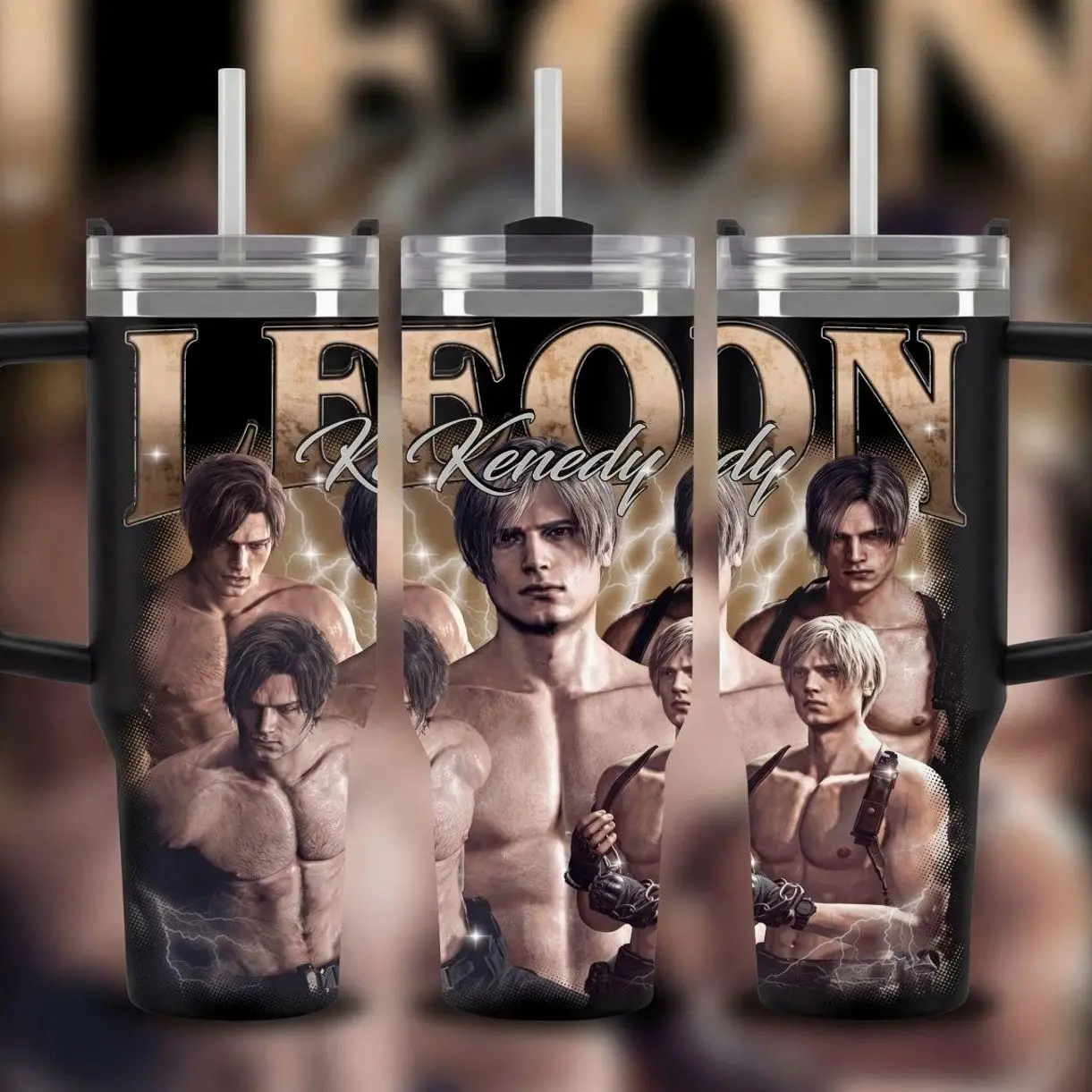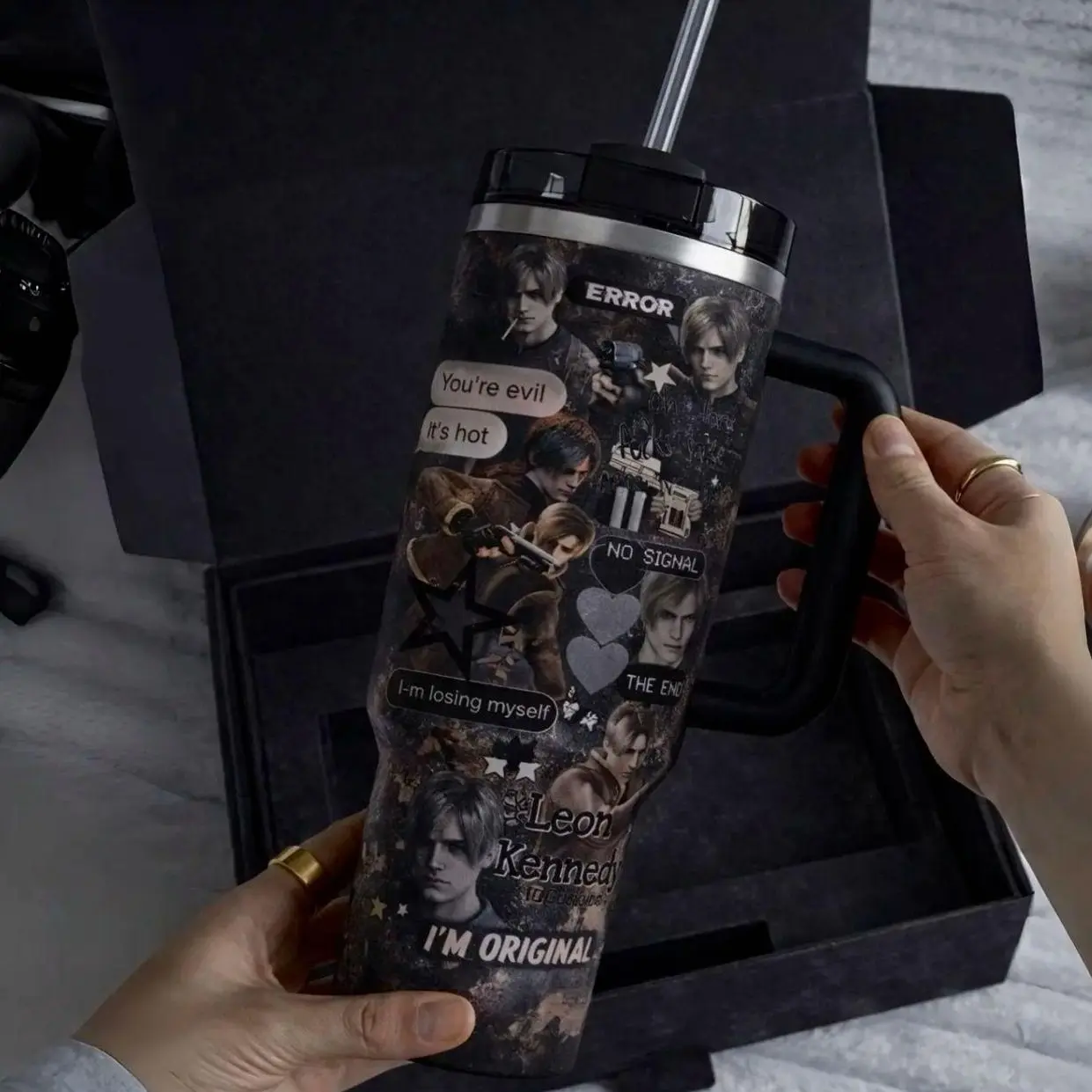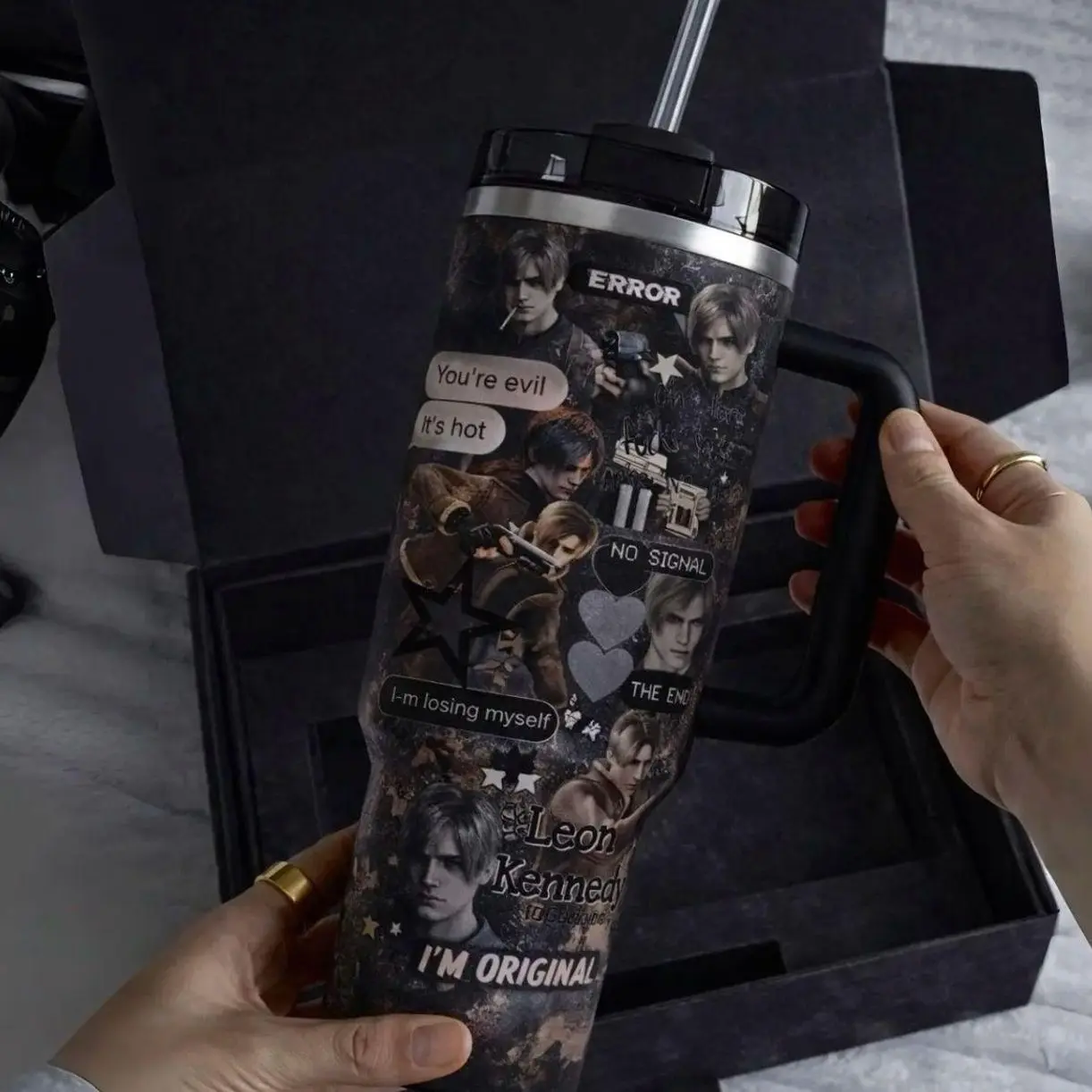 Hot Leon.S Kennedy 40oz Tumbler (Theme box not included), Leon S.Kennedy Resident E Inspired Steel Tumbler, Gift For Gaming Lovers Tumbler with Handle, Black Water Bottle