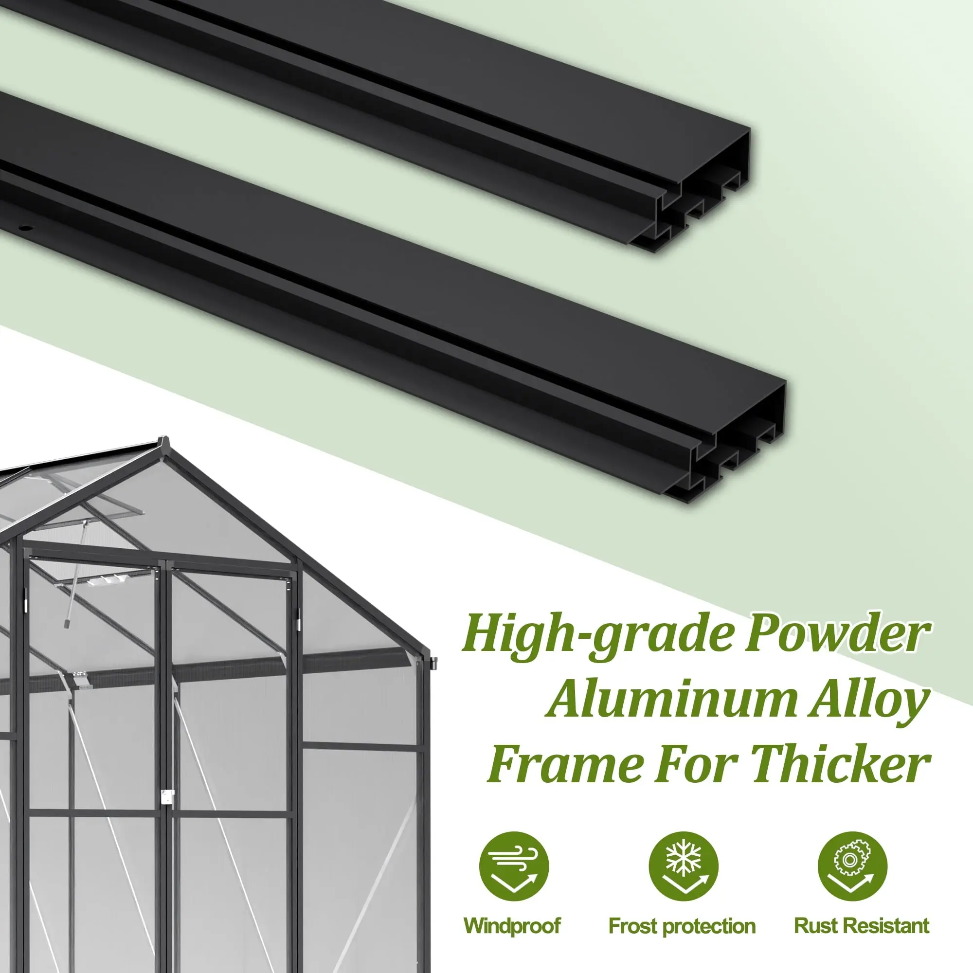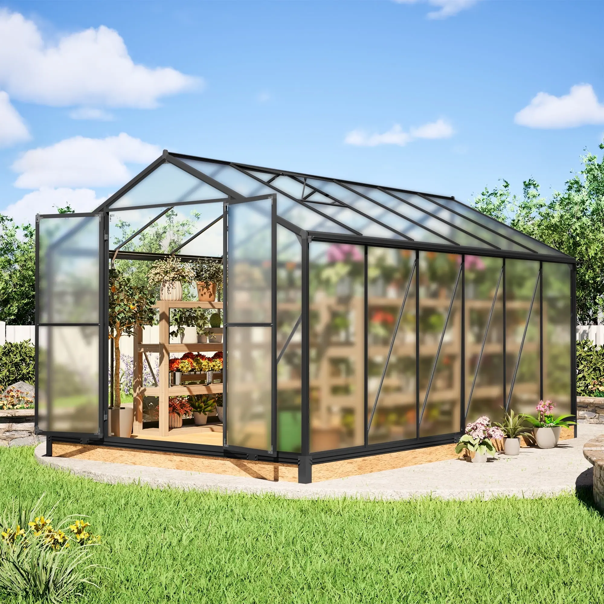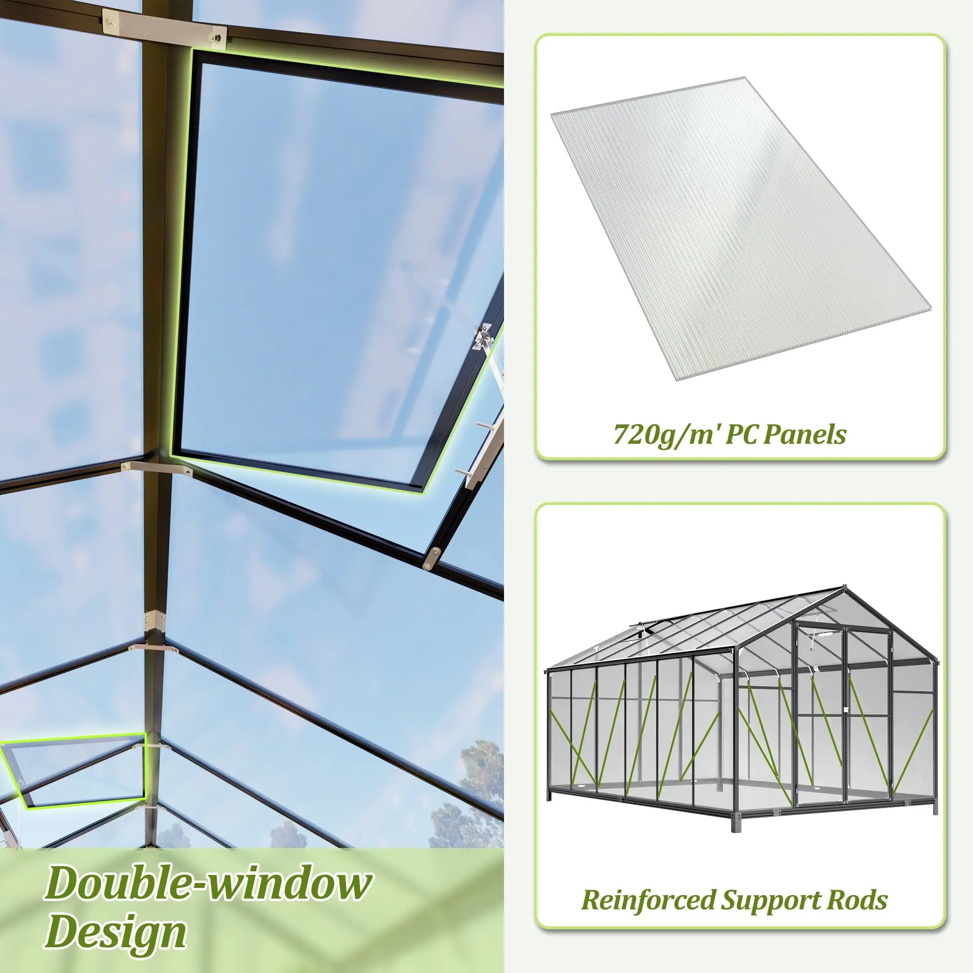 This 12' x 8' walk-in greenhouse features a tall wall design for a spacious growing environment and structural stability. The frame is constructed from aluminum with diagonal braces, and the 720g polycarbonate panels provide durability and weather resistance throughout the year.
