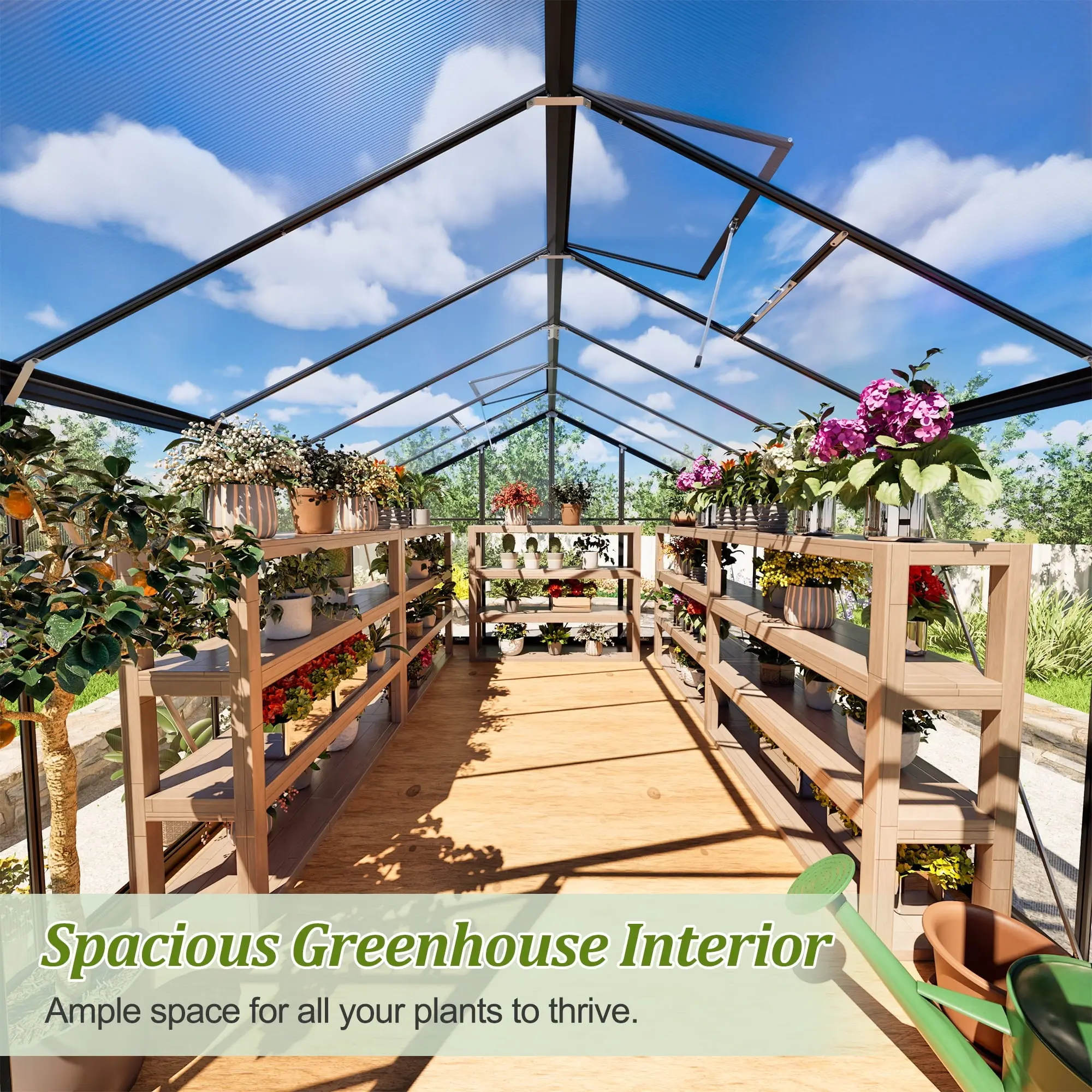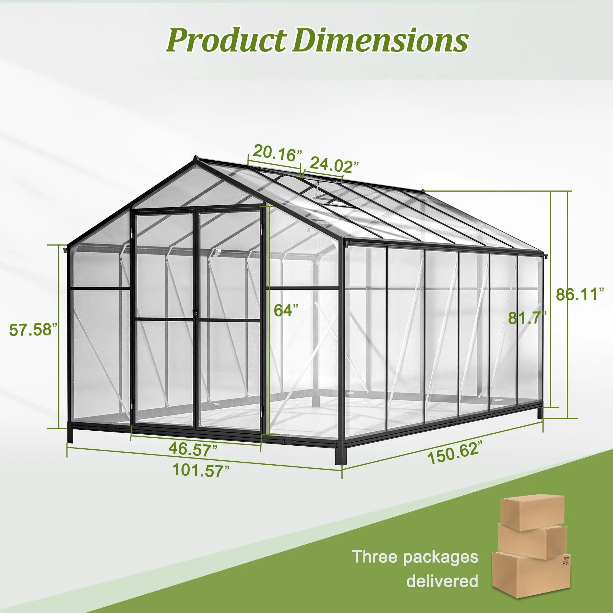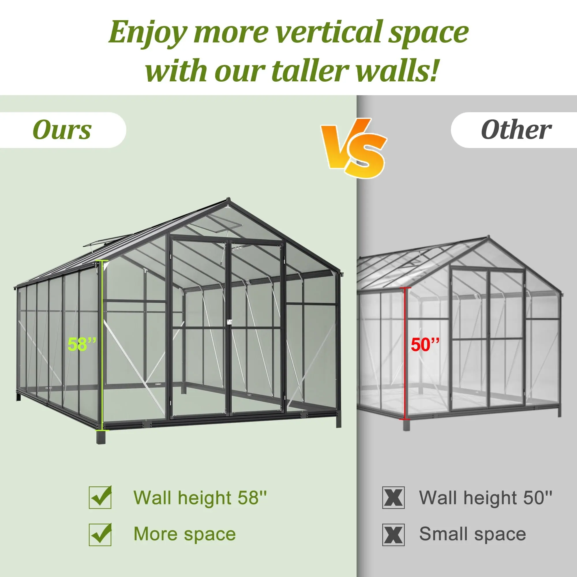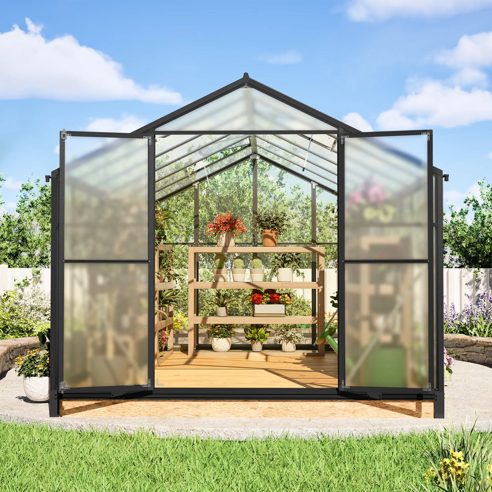 This 12' x 8' walk-in greenhouse features a tall wall design for a spacious growing environment and structural stability. The frame is constructed from aluminum with diagonal braces, and the 720g polycarbonate panels provide durability and weather resistance throughout the year.