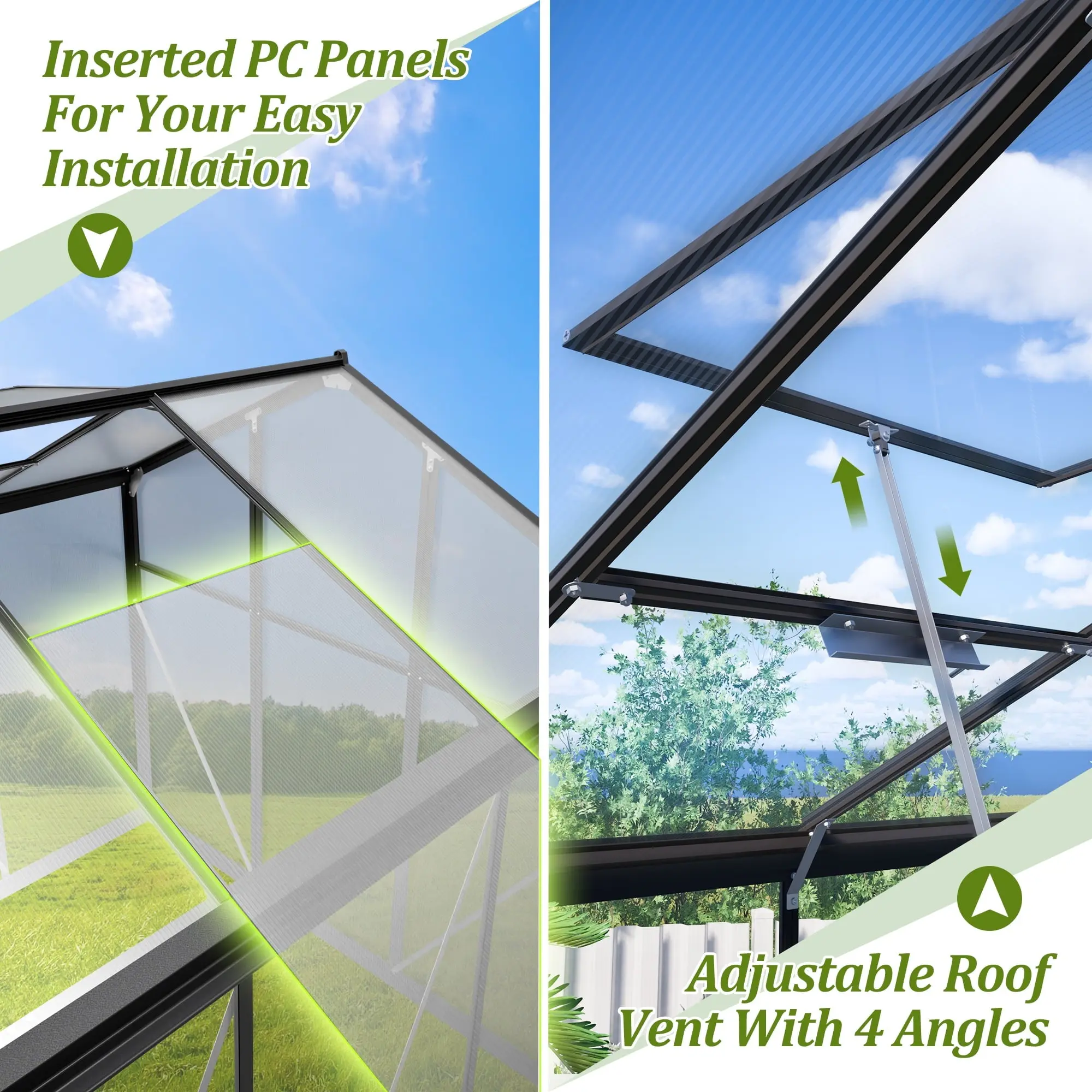 The greenhouse kit is designed for straightforward assembly with slide-in panels, allowing efficient setup. The polycarbonate panels include a UV-resistant coating to filter harmful rays while allowing beneficial sunlight for plant growth.