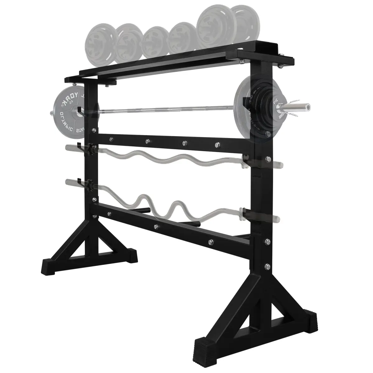 This dumbbell rack features a unique three-tier shelf design with multiple storage posts, allowing dumbbell sets, deadlift equipment, and other weightlifting tools to be stored in one place.It keeps your fitness space tidy and organized, and makes items easy to access.