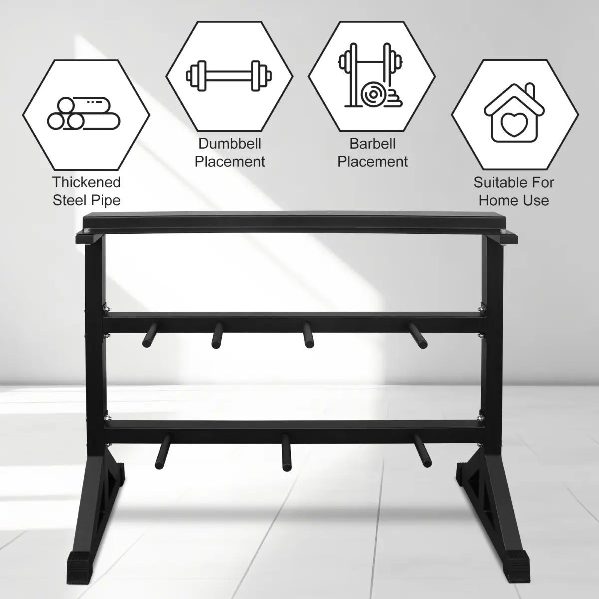 The main body is made of thick steel pipes, providing a compact and stable structure.The rectangular frame design can securely hold various fitness equipment, meeting the needs of daily home or small gym use.