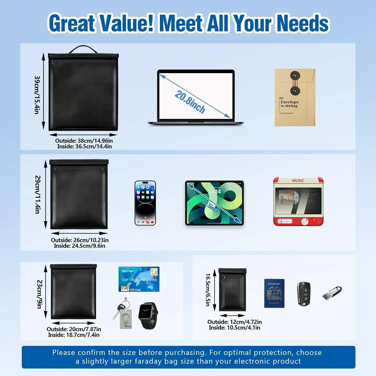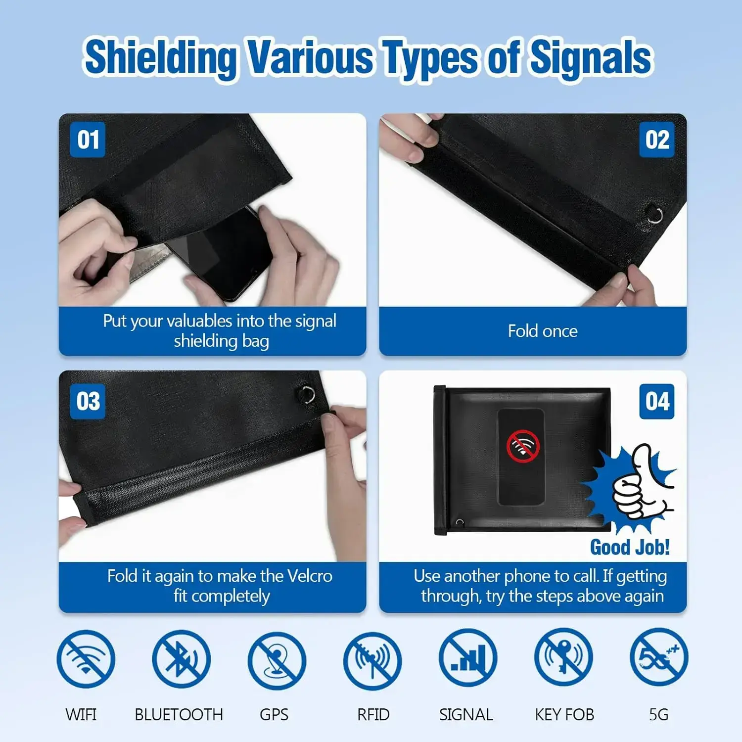 Shield Your Devices, Protect Your Privacy – The Power of Faraday Bags! Q1: Is the internal shielding fabric conductive? A1: Yes, the Faraday bag is effective in blocking signals because of the internal shielding fabric, known as Faraday fabric.This fabric is conductive and should not be washed, as doing so could impair its shielding effectiveness. Q2: Can I put my phone in a Faraday bag and lie in bed listening to something on it? A2: No, when the phone is placed inside a Faraday bag, the signal will be completely blocked.This is also one way to test the effectiveness of the Faraday bag.If you want to learn more methods to verify whether the Faraday bag is working properly, please refer to the user manual, product detail page, and images.They provide detailed instructions on how to test the effectiveness of the Faraday bag. Q3: Is the Faraday bag fireproof? A3: The Faraday bag can resist fire to some degree and safeguard valuable items inside when exposed to low-intensity flames for a short duration.However, if subjected to intense and prolonged fire, its fireproof capability cannot be ensured. Q4: Why does the phone sometimes become very hot when stored in a cool place? A4: When the phone is placed inside a Faraday bag, the signal is blocked, leading the phone to increase its power output, which rapidly drains the battery and adds to the processor's load.Additionally, the bag's effective seal can further contribute to the temperature rise.As a result, no Faraday bag can ensure that your laptop will remain safe from high temperatures if left in a car.To reduce the risk of your electronics overheating in a Faraday bag, you can close unnecessary background apps and switch your phone to airplane mode before placing it inside. Premium Signal Blocking Pouch. Q5: Which signals can a Faraday bag block? A5: Signals Effectively Blocked: 1.Wi-Fi Signals: Faraday bags typically block Wi-Fi signals operating at 2.4 GHz and 5 GHz because these frequencies fall within the radio frequency range. 2.Bluetooth Signals: Similar to Wi-Fi, Bluetooth signals, which usually operate at 2.4 GHz, can also be effectively blocked by Faraday bags. 5G Signals: Faraday bags can block 5G signals, as they cover a broad range of frequencies typically between 1 GHz and 40 GHz. 3.GPS Tracking Signals: GPS signals, which use the 1.57542 GHz frequency, are generally blocked by Faraday bags. 4.Cellular Radio Signals: Faraday bags can block radio signals used for voice and data communication (such as GSM, CDMA, LTE), which operate in the range of hundreds of MHz to several GHz. 5.Electromagnetic Pulse Protection: Based on the principles of a Faraday cage, Faraday bags provide some level of protection against high-energy electromagnetic disturbances, shielding devices from potential damage. Emergency Broadcast Signals: These signals, typically in the radio frequency range, can be blocked by Faraday bags. 6.Electromotive Force Signals: Similar to high-energy disturbances, Faraday bags can offer some protection against electromotive force and electromagnetic field interference. Signals That May Not Be Effectively Blocked: 1.X-rays: Faraday bags cannot block X-rays, as these belong to the high-energy electromagnetic radiation spectrum with strong penetrating power, commonly used in security scanning. 2.Radiation: Faraday bags generally do not block ionizing radiation (such as gamma rays and X-rays), which requires specialized shielding materials like lead. 3.Airport Electromagnetic Fields: Faraday bags may reduce the impact of electromagnetic fields to some extent, but they may be less effective against strong industrial electromagnetic fields or specific frequencies.