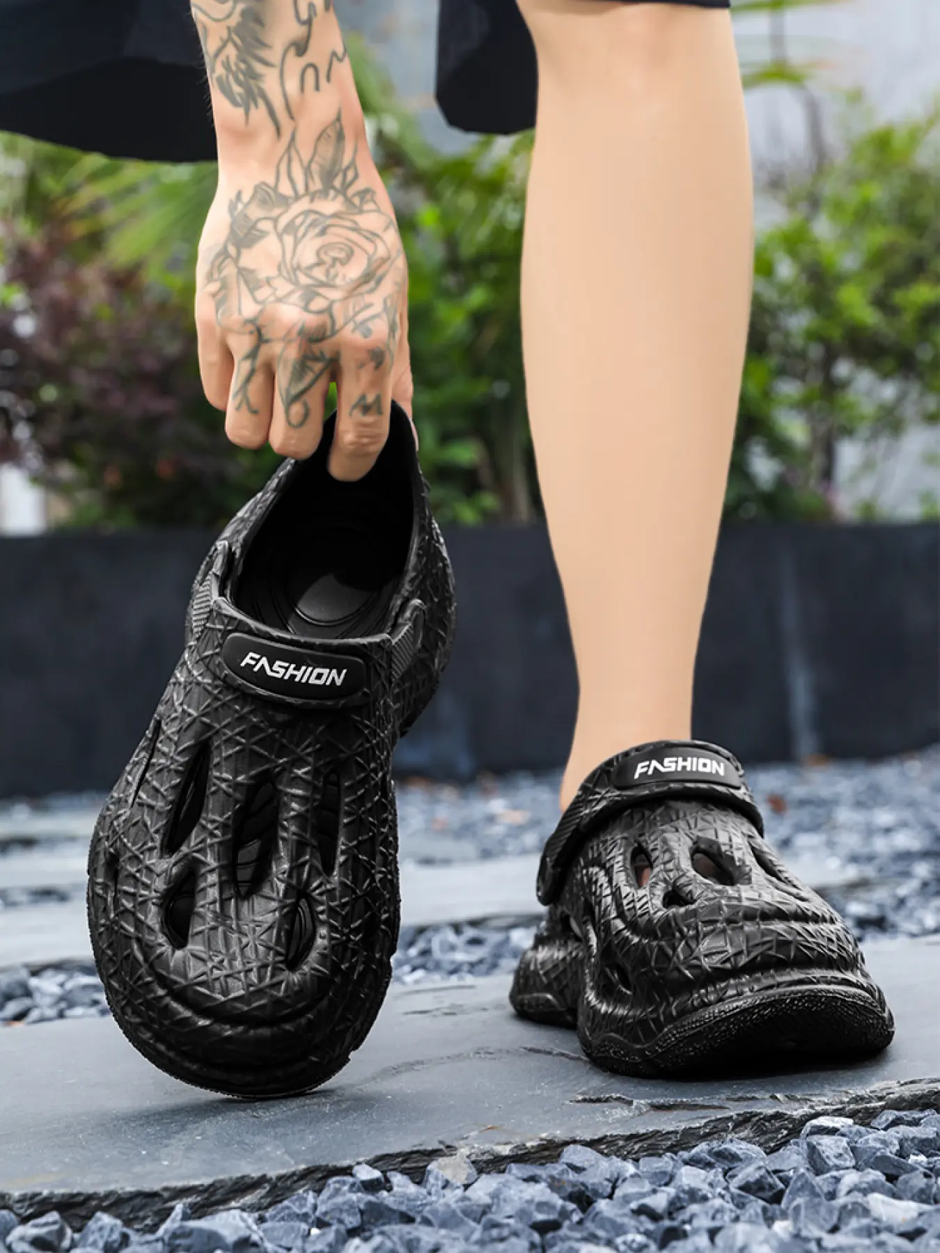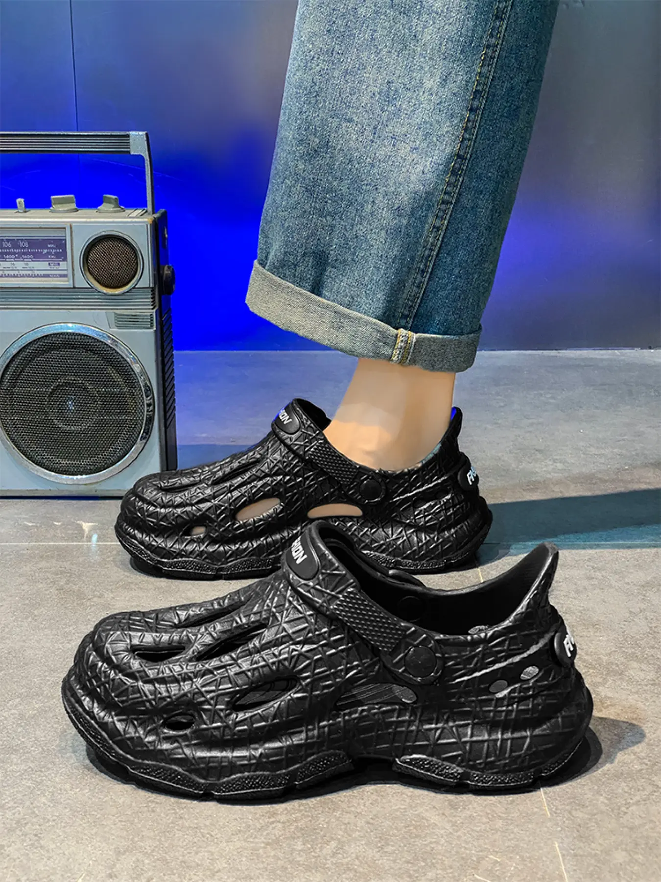 Unisex Black Textured Clogs: Dual-Wear Toe-Cap, Summer Outdoor Beach Slides