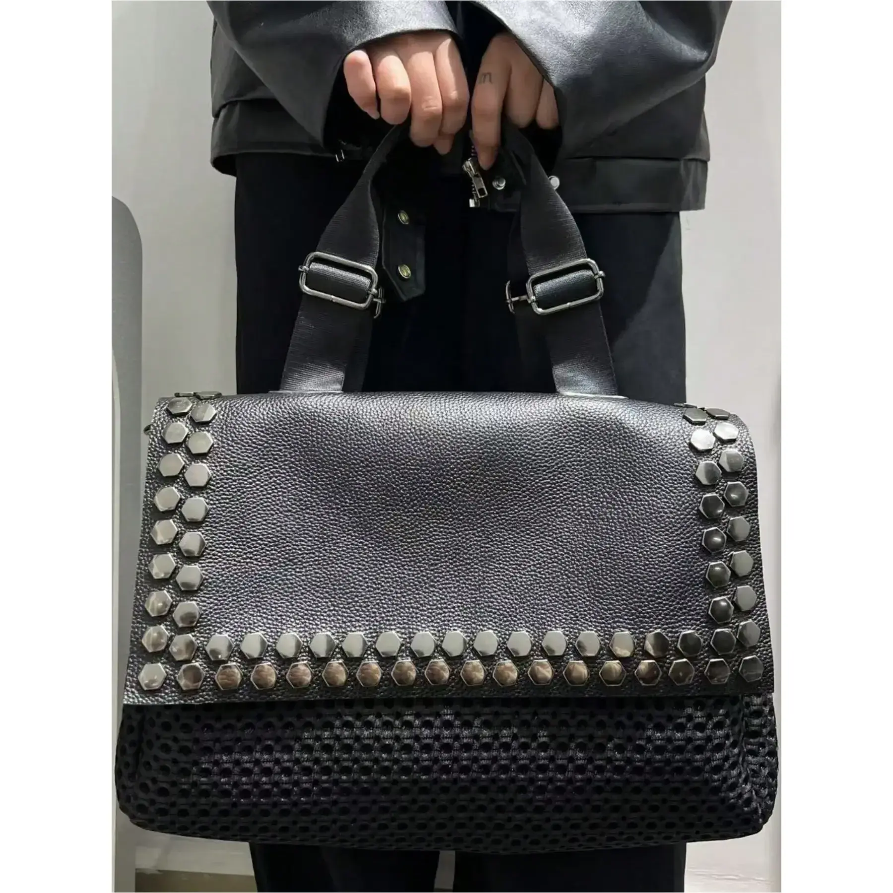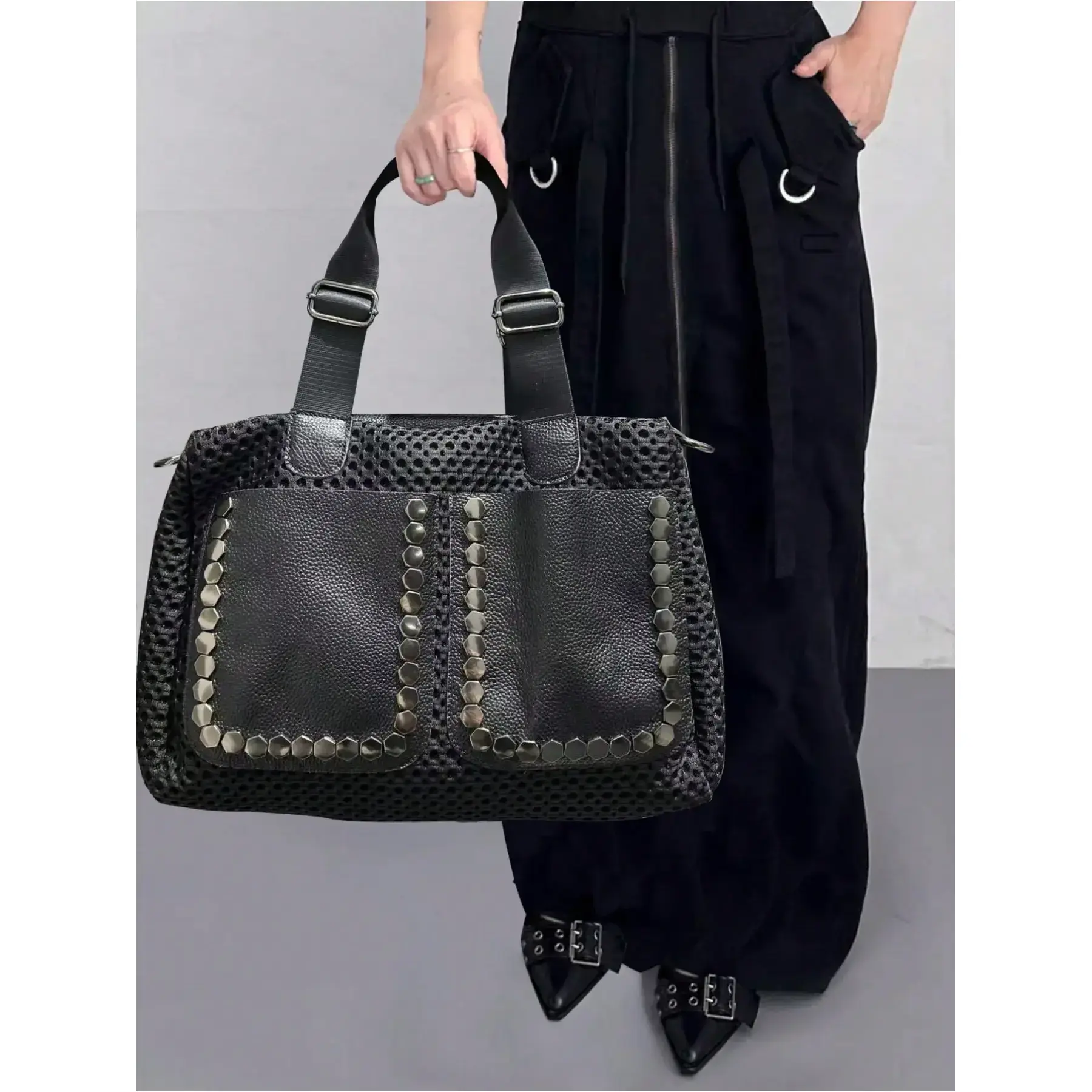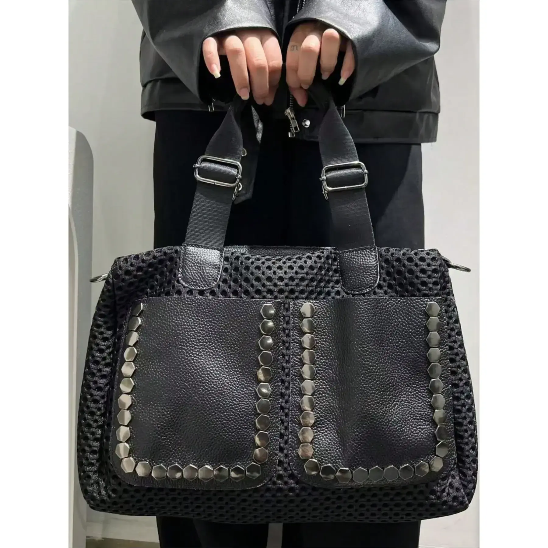 Ladies' fashionable retro casual cool handbag, personalized Y2K spicy girl motorcycle bag, street style rivet spliced city bag, both sides can be used, suitable for work, commuting, dating