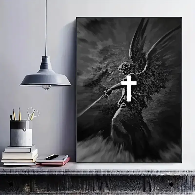 5. 1 piece/set Frameless Canvas Painting Print Poster, Classic Black and White Illustration Art, Angel with the Sword, a perfect gift for religious culture enthusiasts, and an ideal gift for bedroom, living room, kitchen, dorm hallway, mural, wall decoration