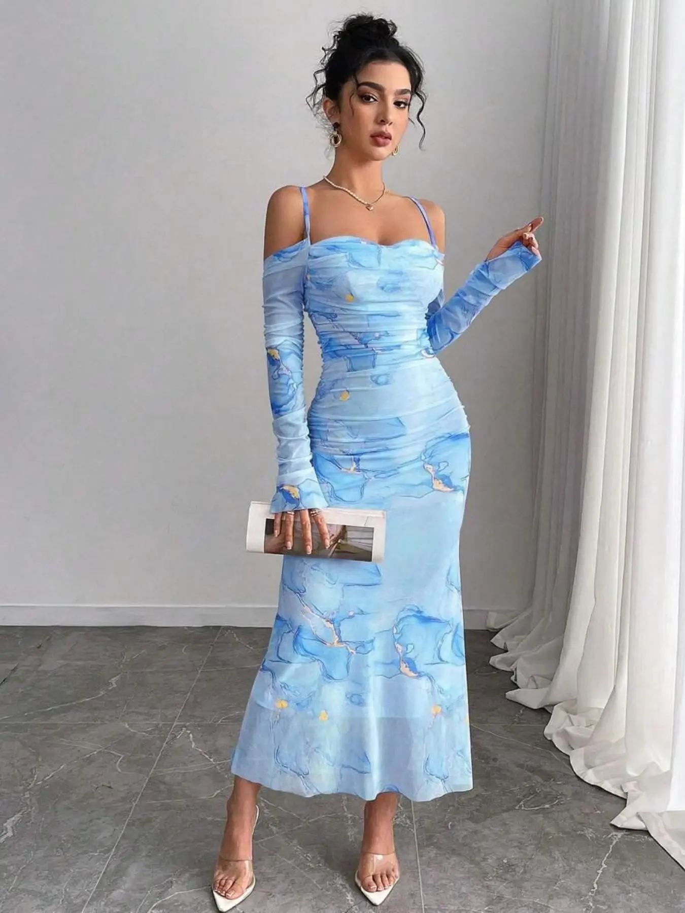Lafayette Women's Mesh Long Sleeve Dress, Off-Shoulder Mermaid Skirt Gown, Elegant Evening Wear, Perfect for Special Occasions