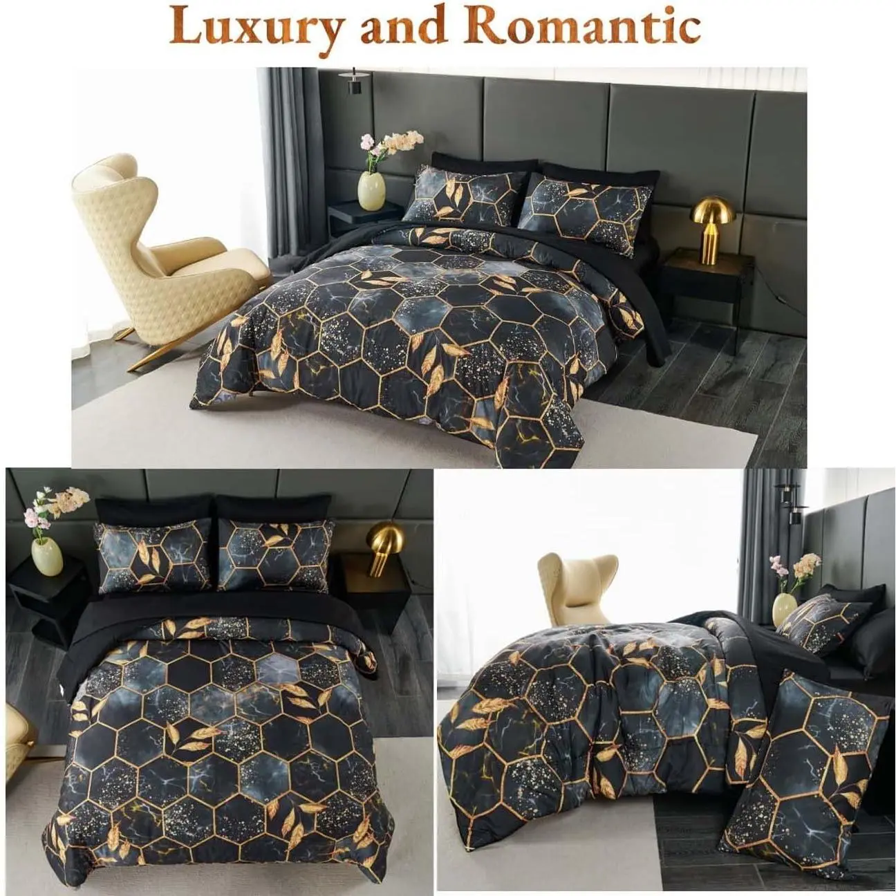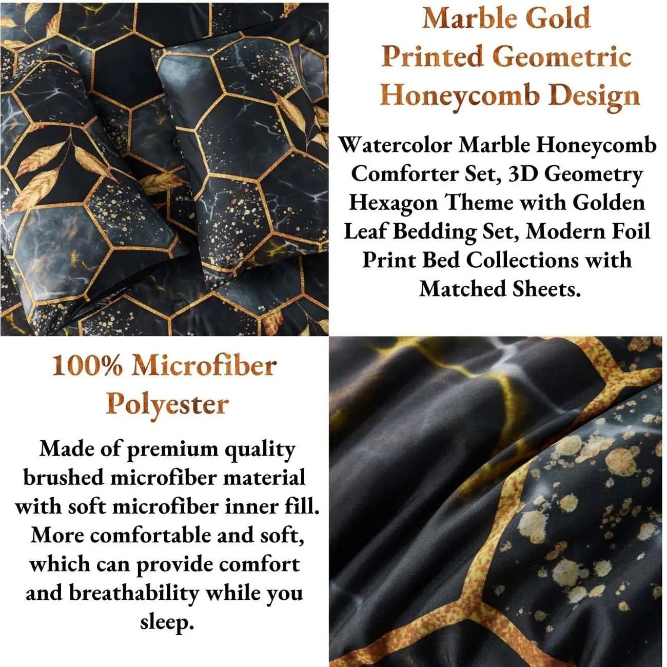 [MATERIAL]: The black gold comforter set is made of premium quality brushed microfiber material with soft microfiber inner fill.The bedding set is more comfortable and soft, which can provide comfort and breathability while you sleep.Bedding can help regulate your body temperature and provide a comfortable sleeping environment.The bedding comforter set is durable and lightweight to use.[7 PIECES GOLD PRINTED GEOMETRIC DESIGN BEDDING SET]: Gold bedding sets can add a touch of luxury and sophistication to any bedroom, while still being practical and easy to care for.Watercolor marble honeycomb comforter set is a stylish and comfortable addition to any bedroom, with a unique and eye-catching design and a range of features to suit different preferences and needs.[YEAR ROUND]: This marble honeycomb comforter set is ideal for year round use, You can use bedding all season.The bedding set keep you warm in the winter.You can also use the bed set in the summer.Our bedding comforter set can be used directly without duvet cover.Reduce your time on making the bed.As well as you can make a down alternative comforter with your favorite duvet cover.[7 PCS COMFORTER SET FULL SIZE INCLUDING]: 1 comforter: 80'' x 91'', 1 fitted sheet 54'' x 75'' +16'', 1 flat sheet 81'' x 96'', 2 gold trim hexagon 20'' x 30'', 2 solid color pillowcases 20'' x 30''.[Easy Care]: The full comforter bedding set is washable. Machine wash cold water separately for gentle circulation. Air dry or dry on low temperature. No long-time soaking for durable use. Please don't bleach. Because the comforter is packed in a compression package. It is recommended to bake the bedding in the sun and pat it gently during baking to fluff it up.