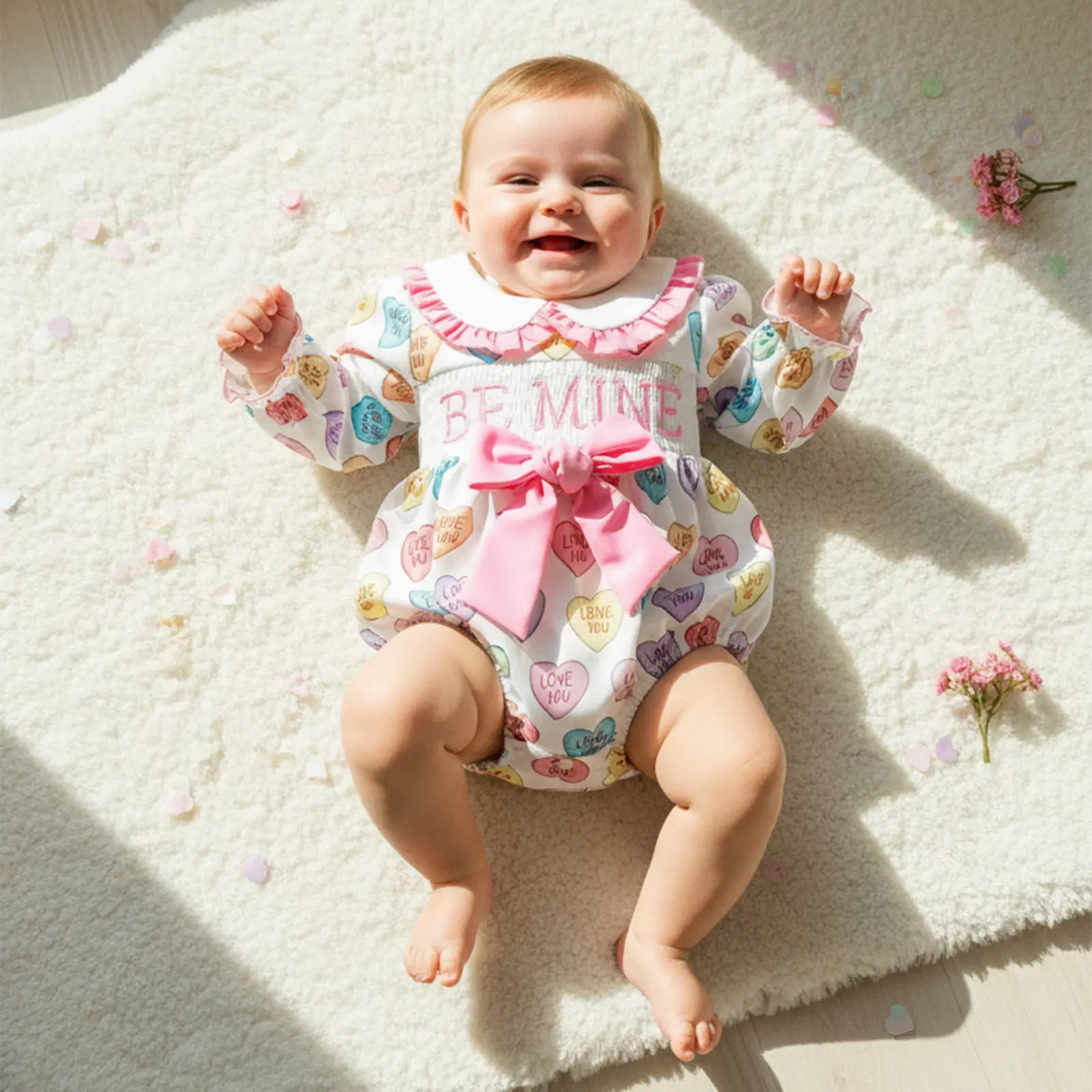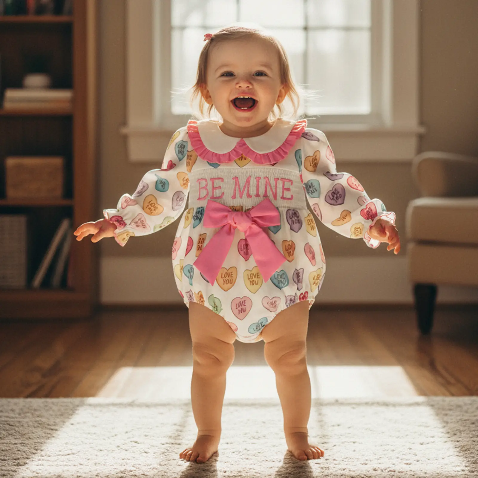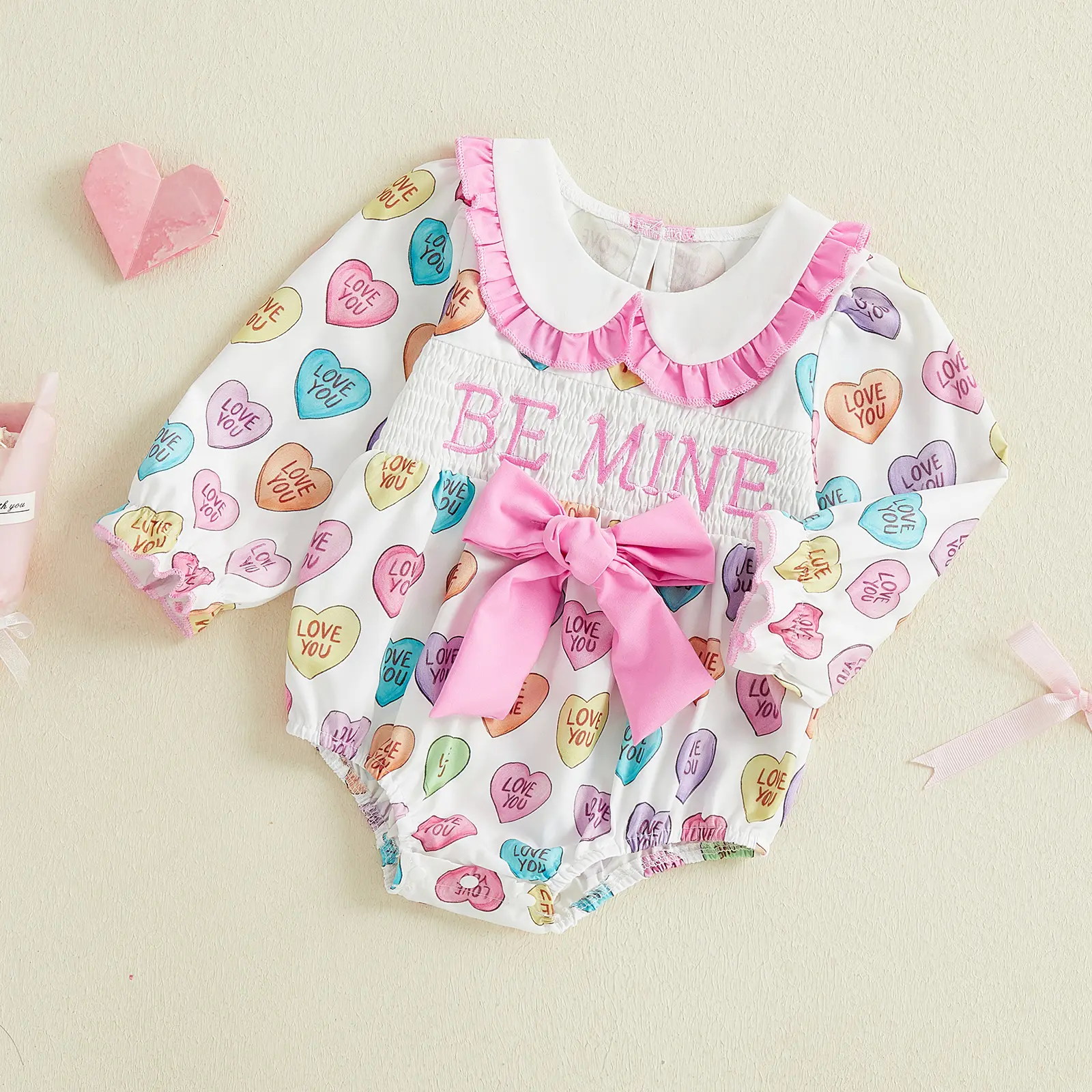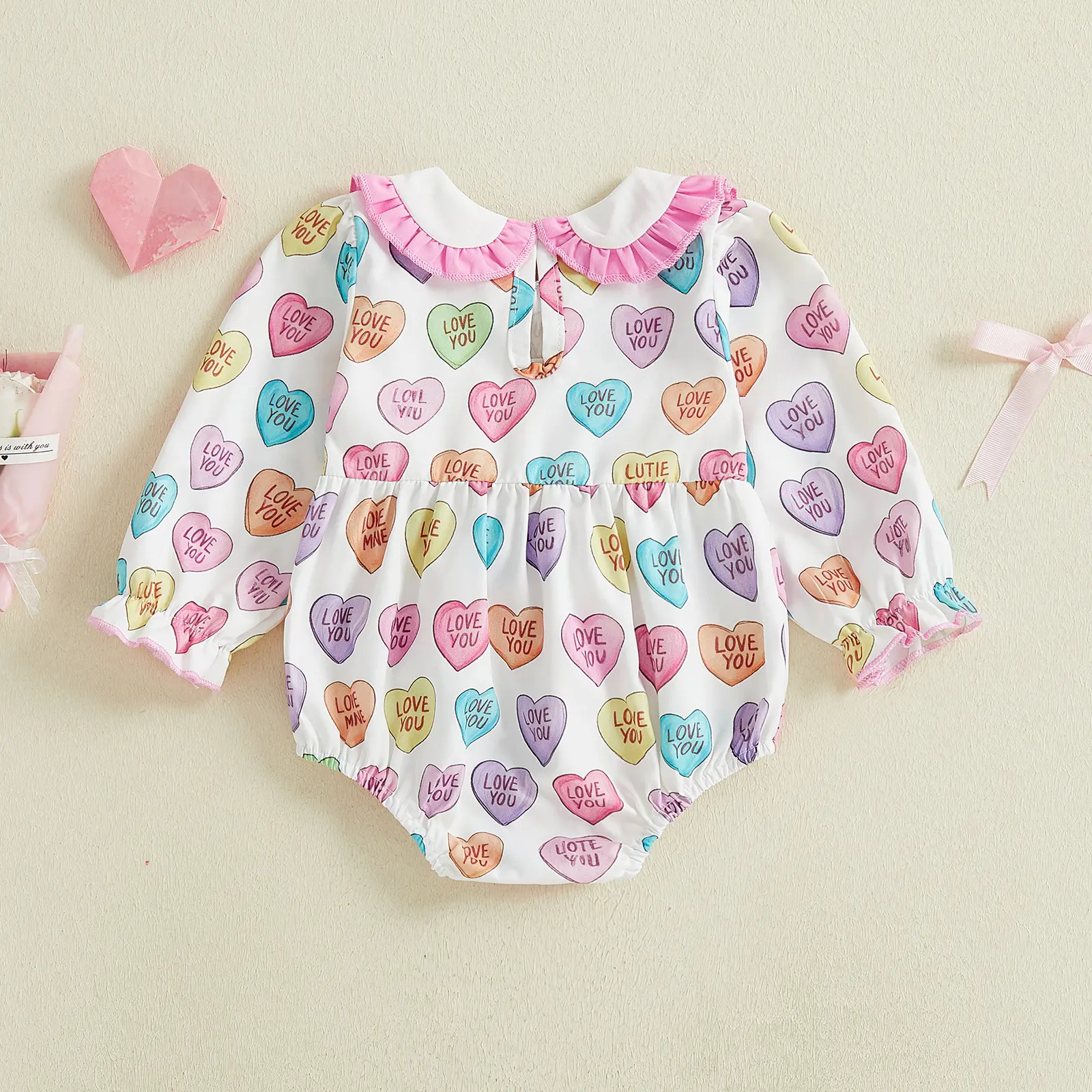 Baby Girl Valentine's Day Romper Long Sleeve Doll Collar Letter Heart Print Romper with Bow Decor