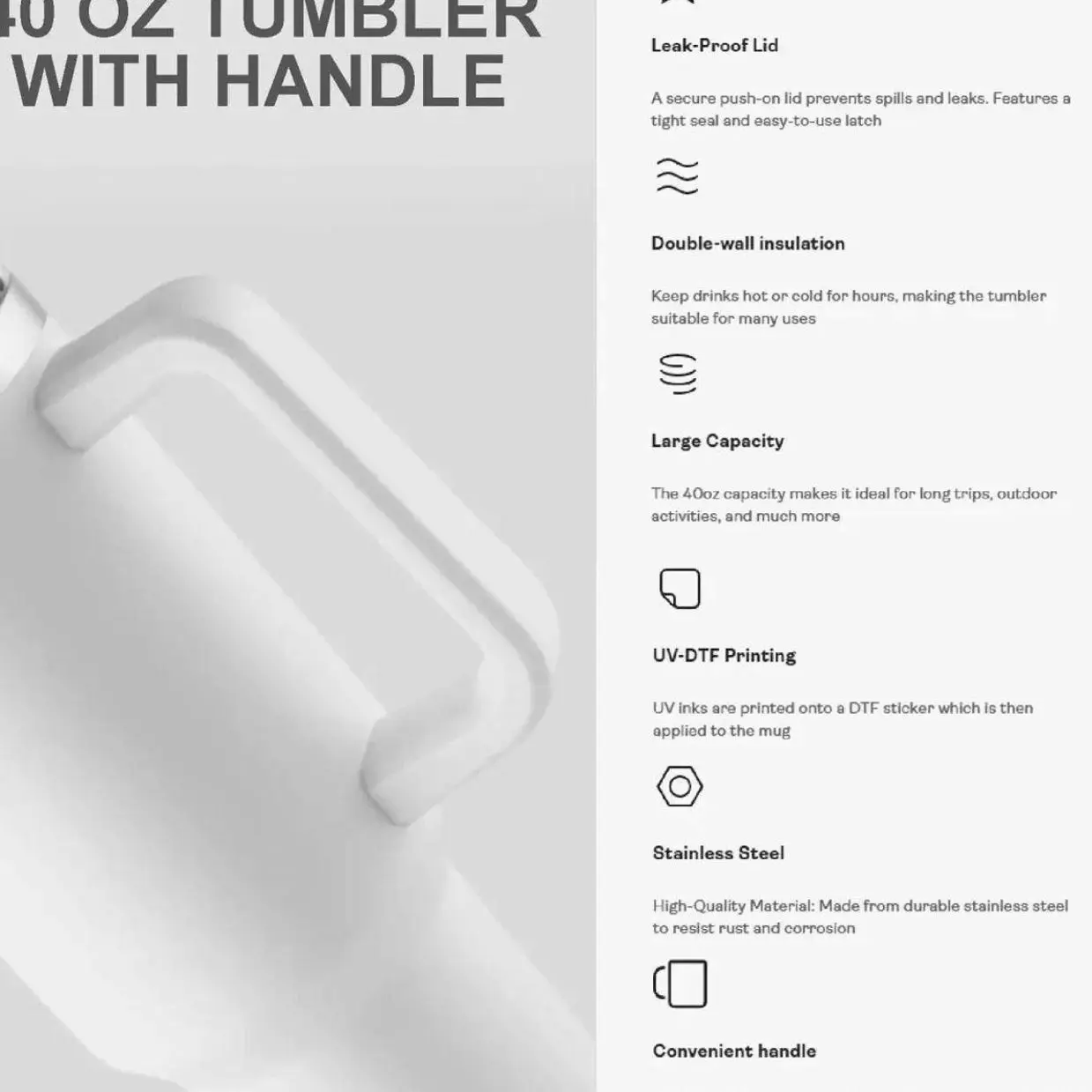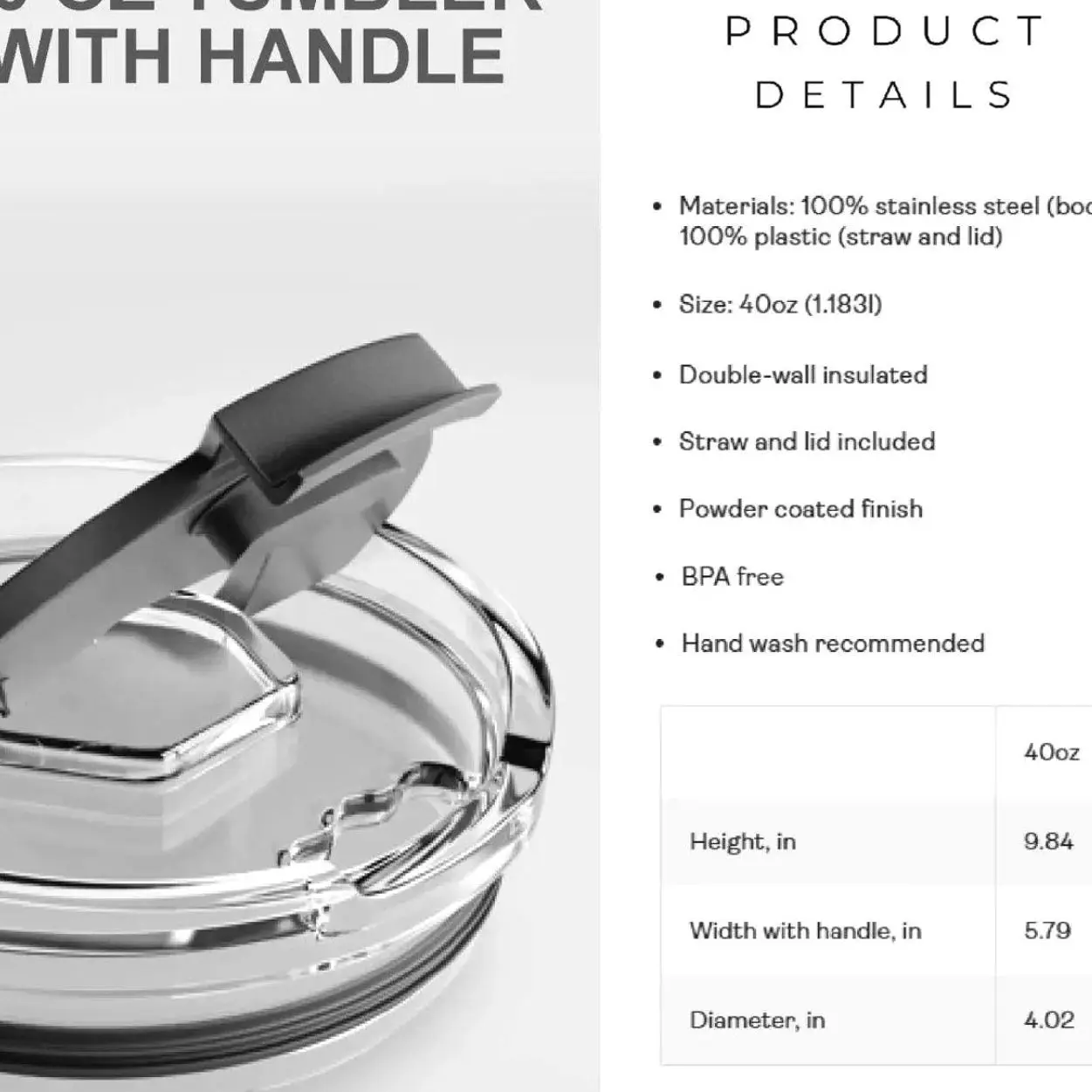 Ergonomic Handle (40oz): Designed for easy carrying all day long.