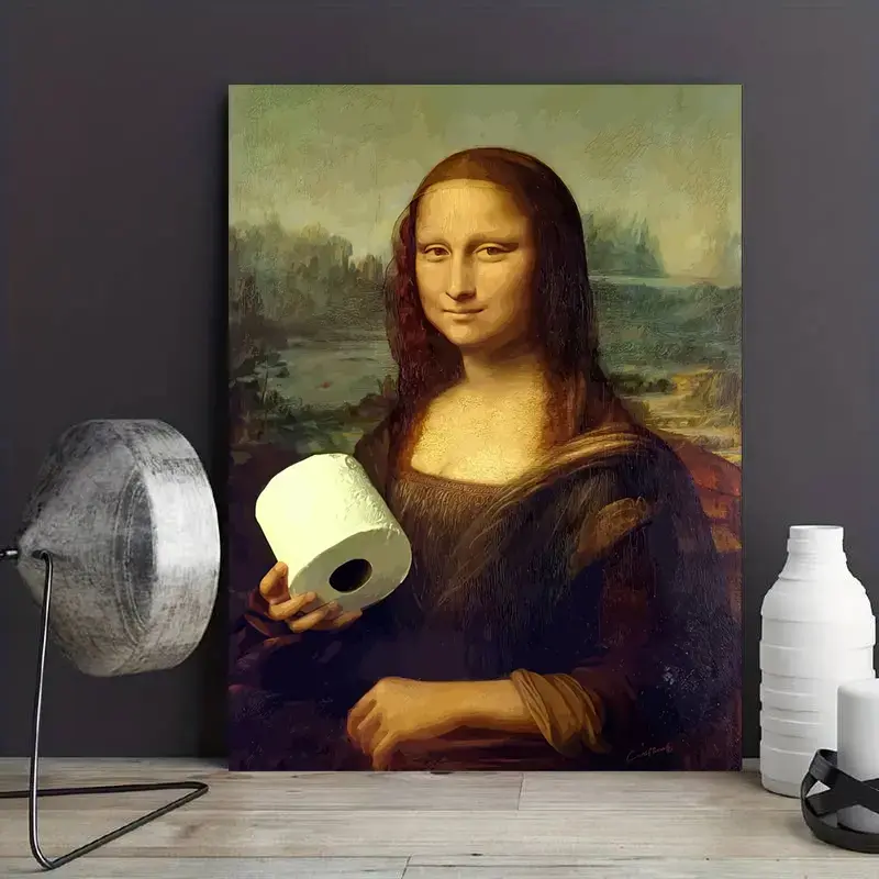 1 piece/set frameless canvas painting print poster, classic funny abstract art, funny bathroom Mona Lisa holding toilet paper, dedicated to those who like unique artwork, ideal gift for bedroom, living room, kitchen, dormitory corridor, mural, wall decor