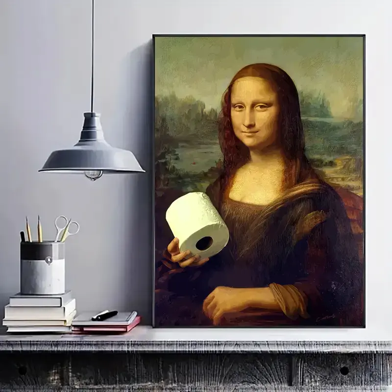 5. 1 piece/set frameless canvas painting print poster, classic funny abstract art, funny bathroom Mona Lisa holding toilet paper, dedicated to those who like unique artwork, ideal gift for bedroom, living room, kitchen, dormitory corridor, mural, wall decor