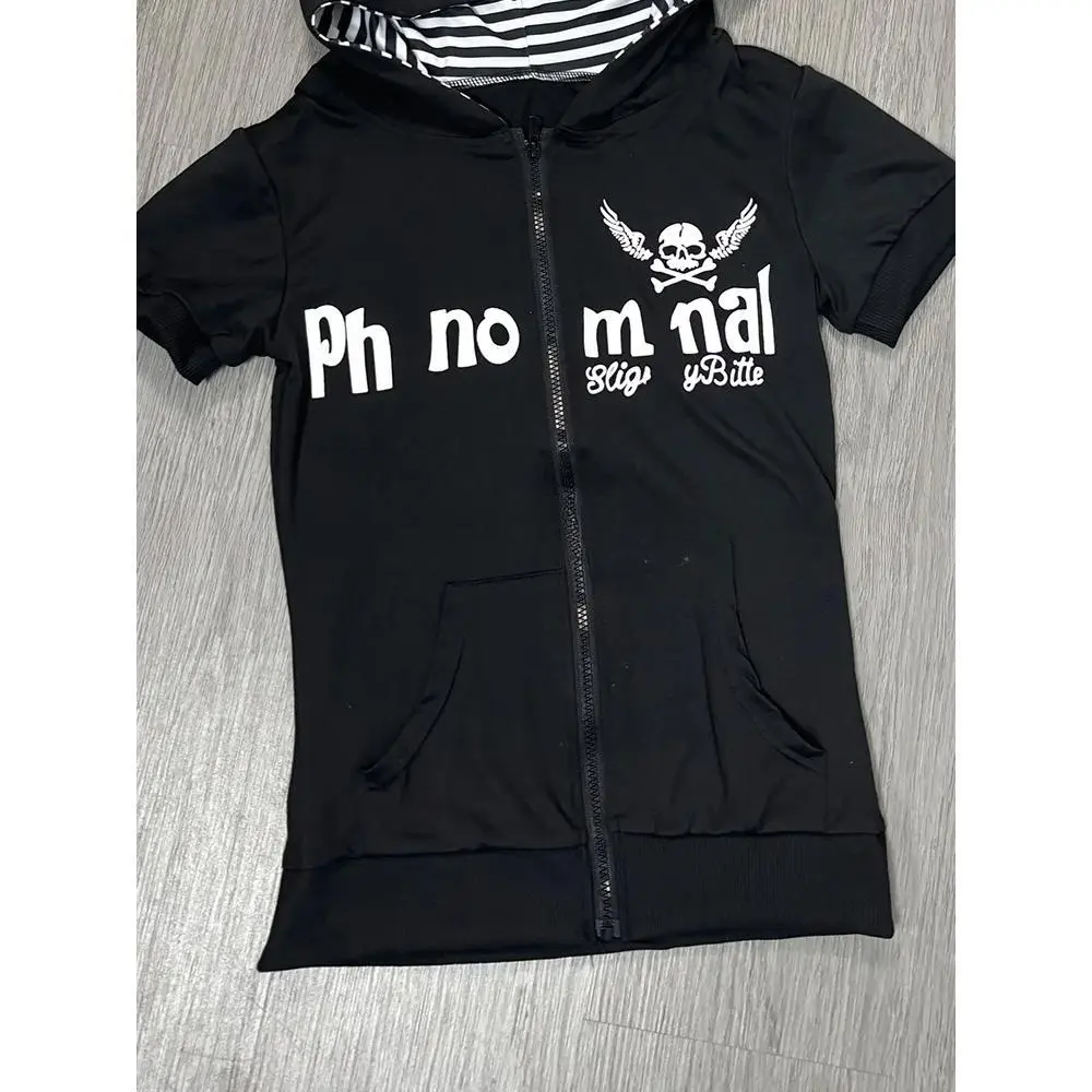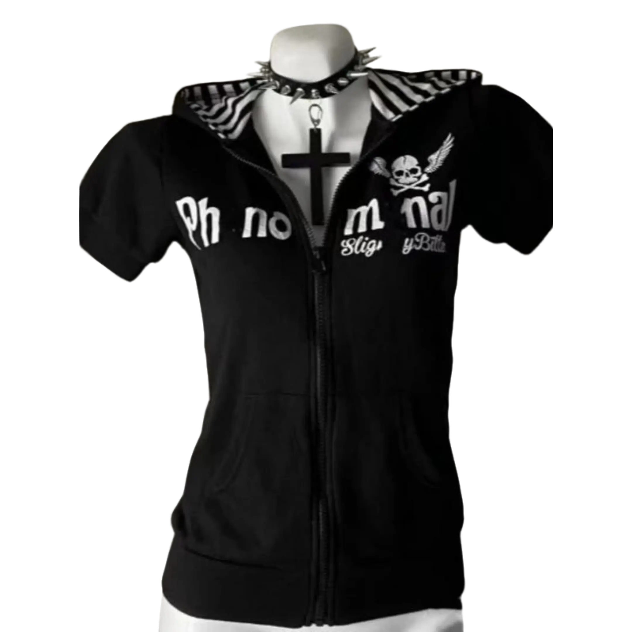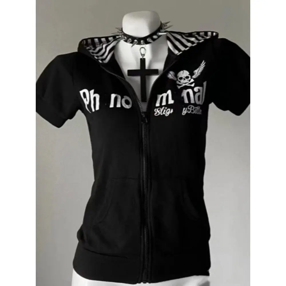 Step into the world of retro fashion with our Y2K Subculture Skull Print Zip Cardigan.Designed for the modern woman who appreciates a blend of vintage style with contemporary flair, this hoodie is a must-have for anyone looking to add a touch of nostalgia to their wardrobe.The skull print, reminiscent of the Y2K era, is bold and eye-catching, making a statement with every wear.The slim fit cut ensures a flattering silhouette, while the short sleeves provide a casual, laid-back vibe.Whether you're heading out for a day of shopping or meeting friends for a casual hangout, this hoodie is versatile enough to complement any outfit.