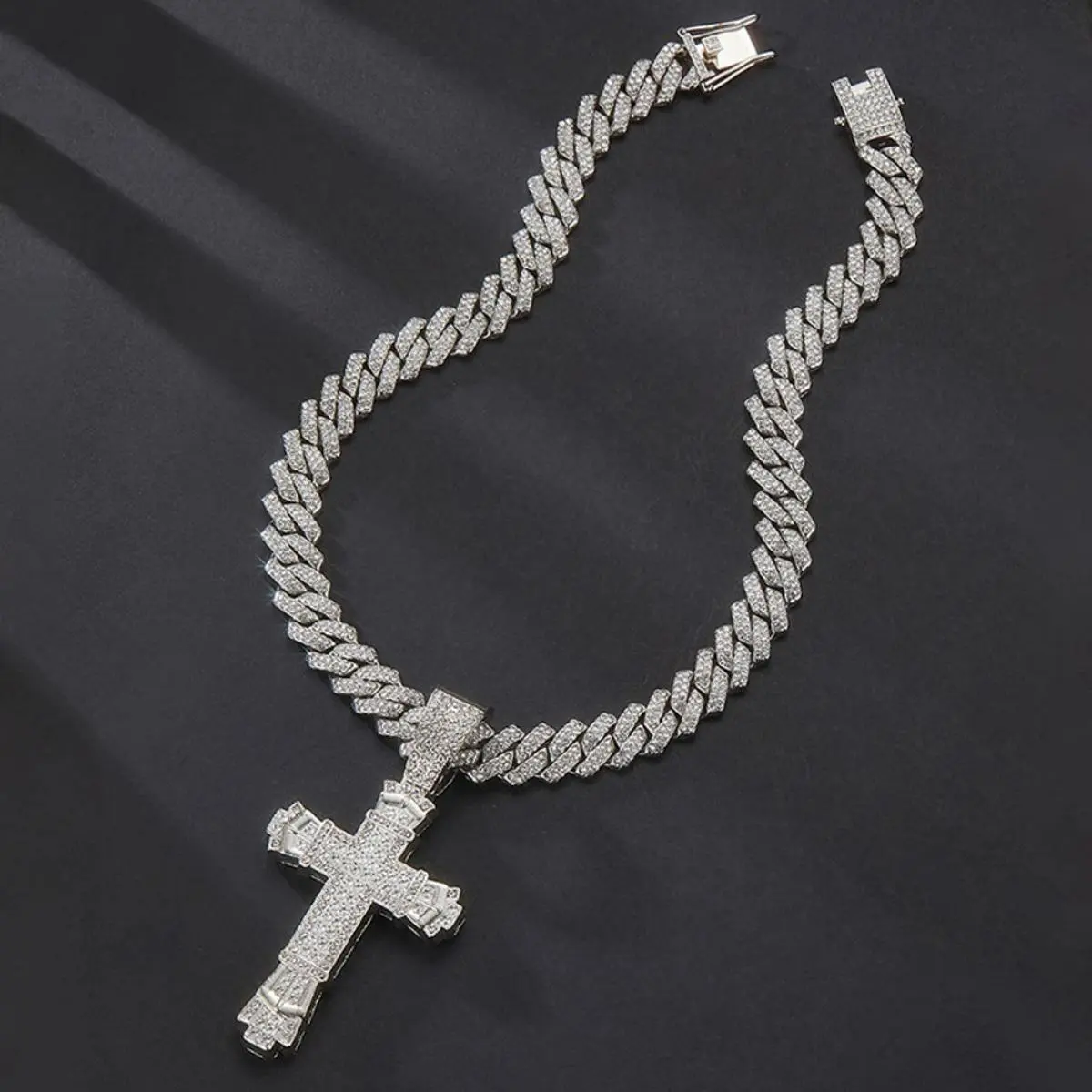This hip hop cross pendant necklace features a high quality alloy base with a full rhinestone inlay that catches light beautifully. The cross pendant is paired with a Cuban link chain for a bold street style look. Surface has an anti tarnish coating for long lasting shine. The necklace fits both men and women and works well for daily wear parties streetwear or casual outings. Wear alone or layer with other chains. Comes in a gift box ready for use or gifting.