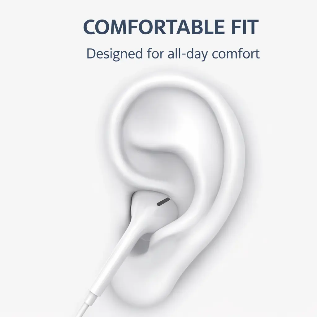 Comfortable Fit Ergonomic earbud design fits naturally in your ears for long-lasting comfort without pressure.