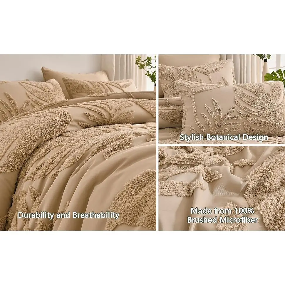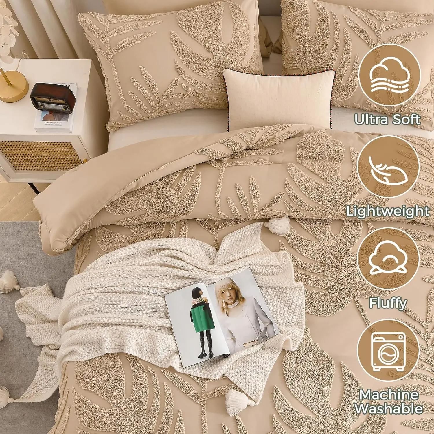 Khaki Queen Comforter Set,Boho Soft Warm Tufted Neutral Bed in a Bag,Lightweight All Bedding with Botanical Palm Leaf Pattern,3 Pieces (Comforter&2 Shams)