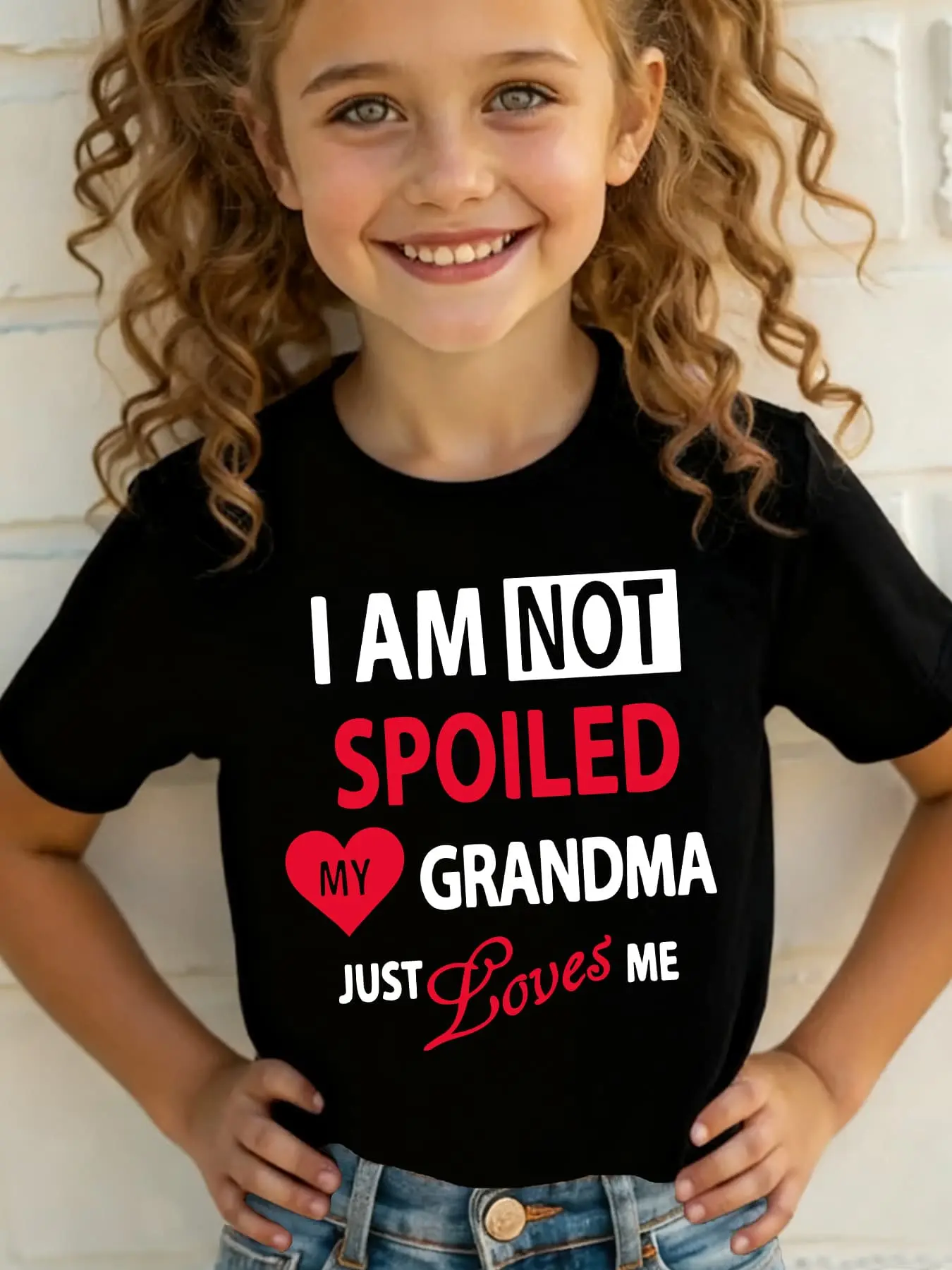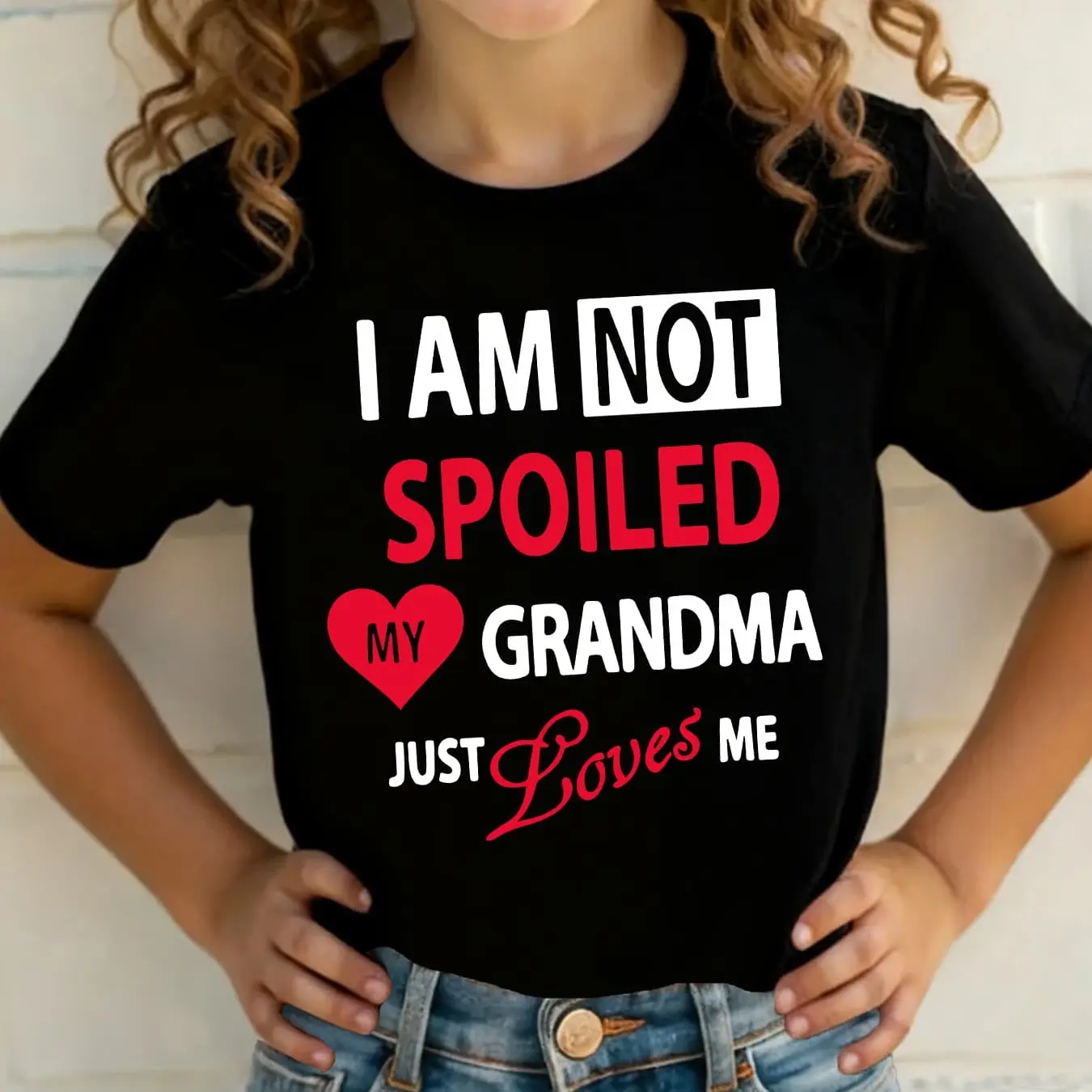 Featuring the phrase "I AM NOT SPOILED MY GRANDMA JUST LOVES ME" in bold typography, this t-shirt celebrates the special bond between granddaughters and grandmas. The red heart accent and high-contrast design on a crisp white base create a sweet, laugh-out-loud look. Families will adore this design, making it a fun and heartfelt piece.