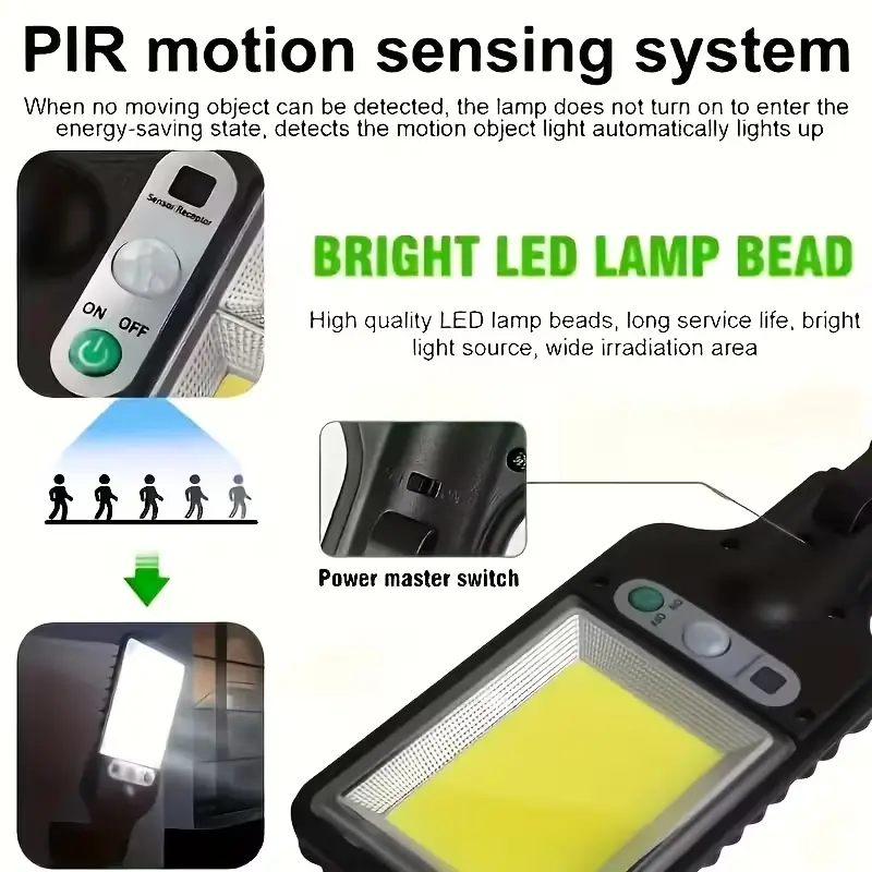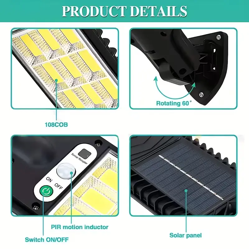 108 LED beads motion sensor outdoor lights; up to 200 lm 6500 K bright output and good heat dissipation. Ideal as outdoor solar lights for yard, solar porch lights outdoor, solar security lights outdoor, solar wall lights outdoor, etc