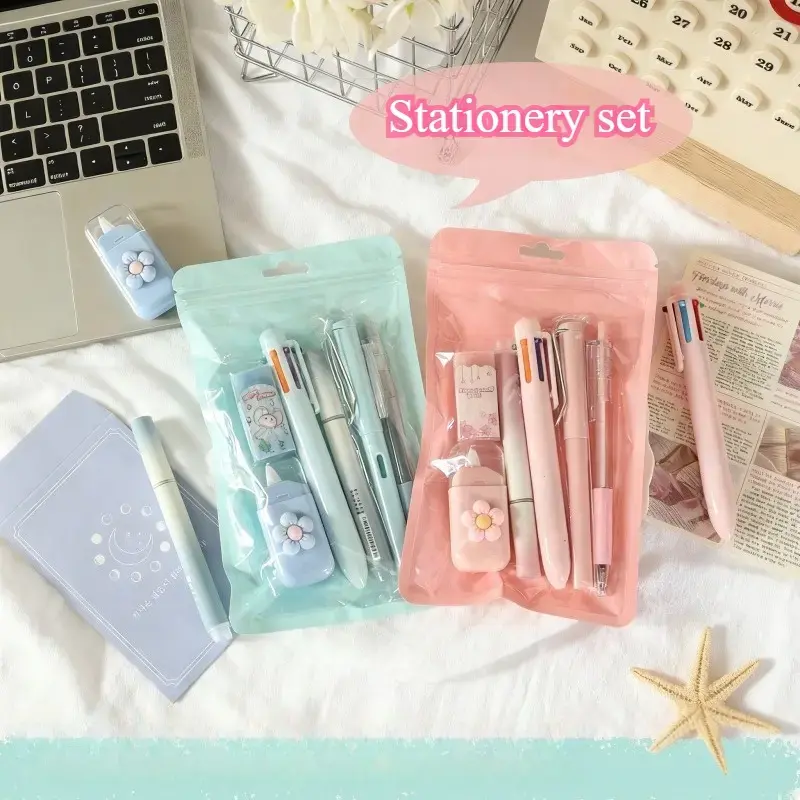 ·7 Pcs Cute Stationery Set: Kawaii School Supplies Office Supplies Including: 6-in 1 Ballpoint Pen, Retractable Gel Pen, Eternal Pencil, Highlighter, Eraser, Correction Tape, Utility Knife. A great add-on to school supplies, office desk supplies, pen pal kit. (Note: Includes a small KNIFE.)