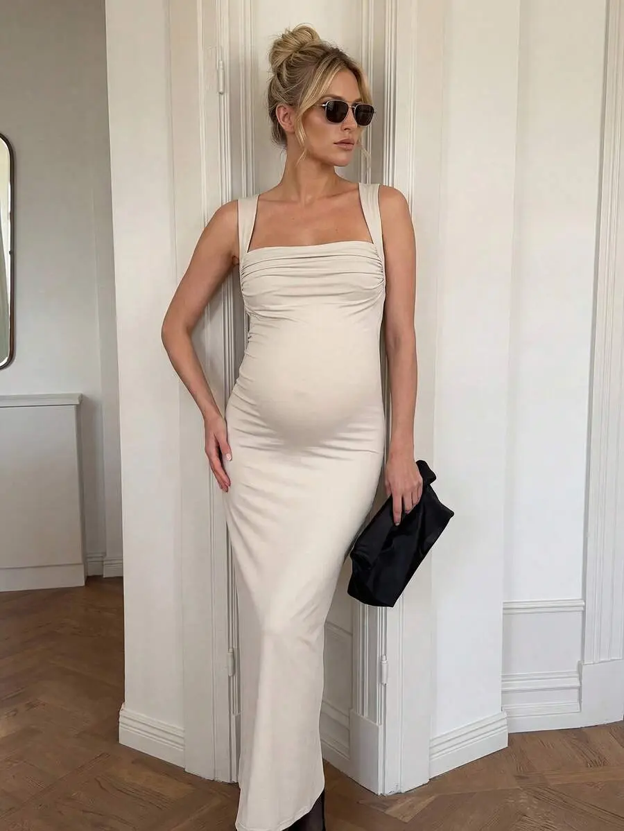 TAMALLA MaterniWear Pregnant Women's Solid Color Pleated Backless Elegant Party Dress