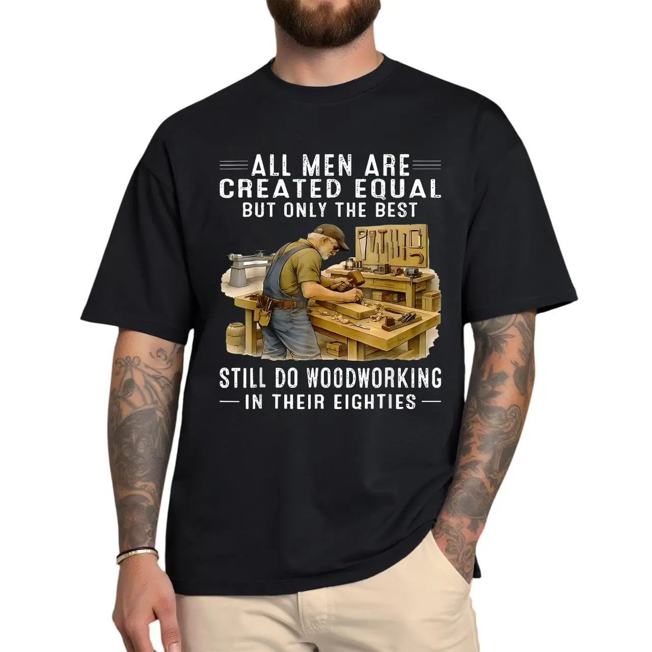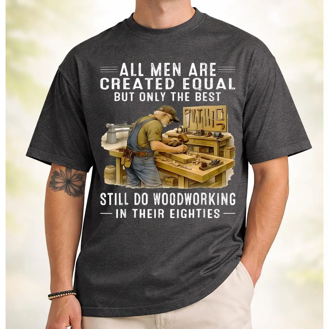 Headline: Precision At 80. Because Some Skills Only Get Better With Age. They say all men are created equal, but once you hit your eighties and you're still turning bowls and joining dovetails by hand, you're in a league of your own. Our "Woodworking in Their Eighties" T-Shirt is a badge of honor for the men who have spent a lifetime perfecting their craft and still find peace in the scent of fresh sawdust.