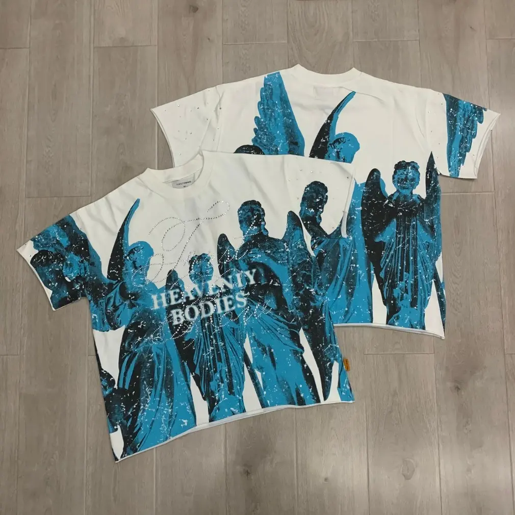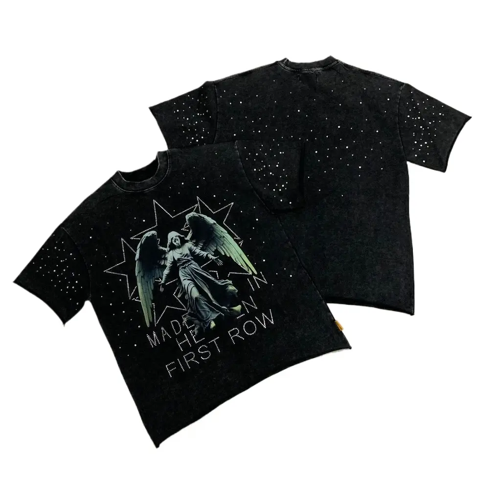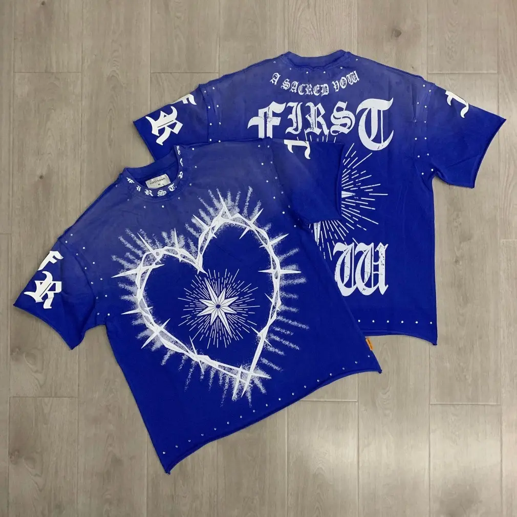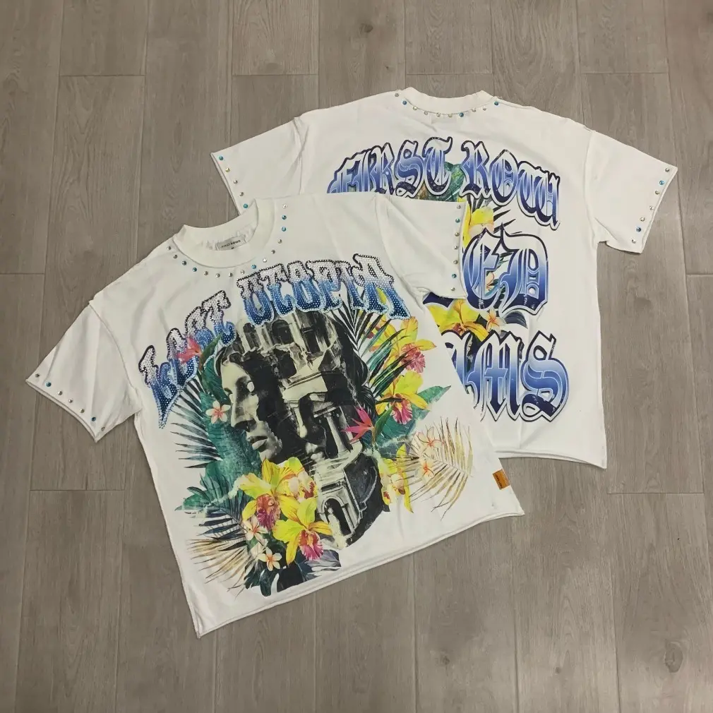 First Row Streetwear Vintage Washed Diamond Rhinestone Cropped Tee Y2K Retro Hip Hop Bling Shiny Graphic Oversized Loose Fit Crew Neck Short Sleeve Pure Cotton Viral Trendy Casual Daily Couple Matching Summer Streetwear Must Have Top For Men Unisex