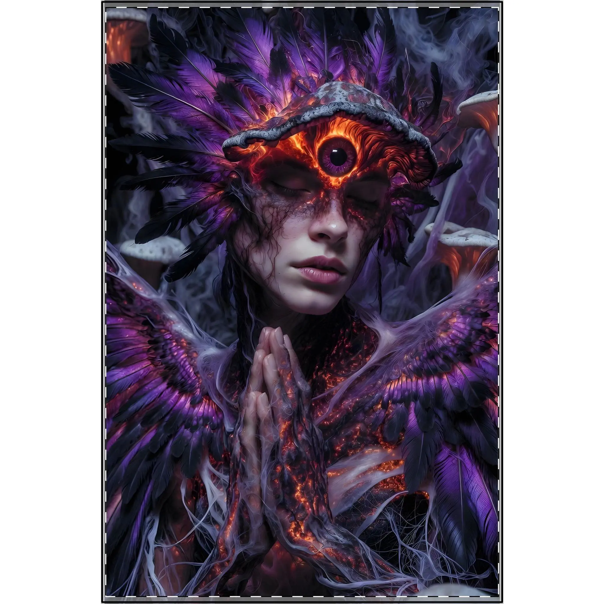 Ember Spore Phoenixkin - Mystical Rebirth Goddess with Glowing Third Eye | Psychedelic Wall Art