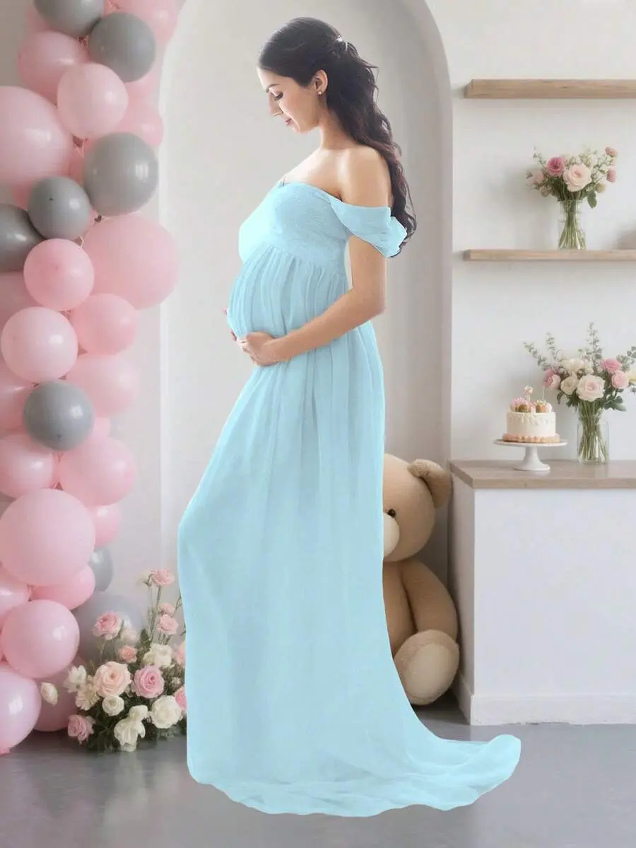 TAMALLA Maternity Solid Color Off-Shoulder Backless Maxi Maternity Dress For Baby Shower, Christmas Party, Elegant Party