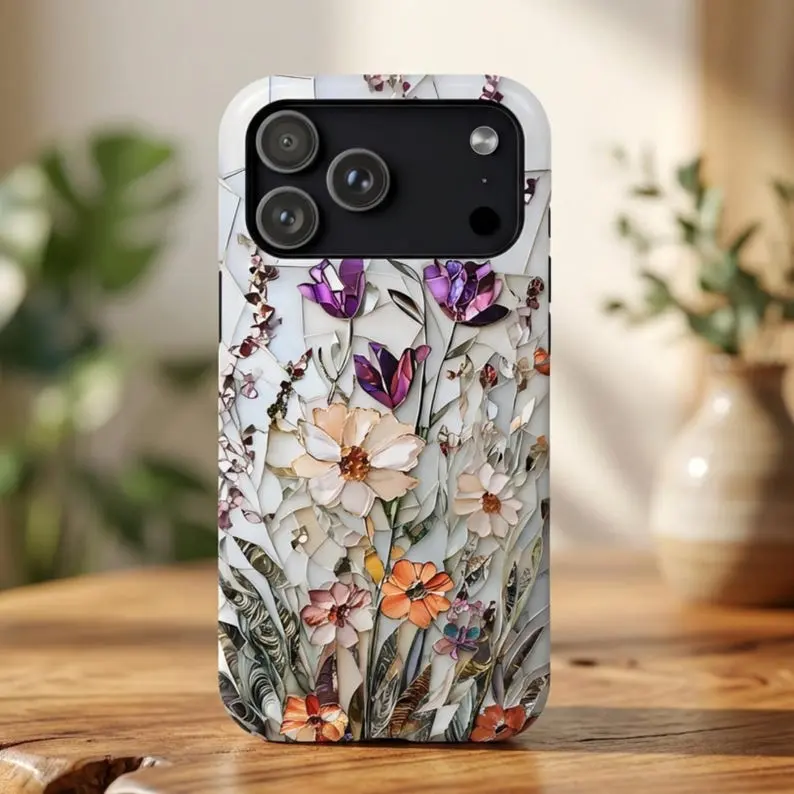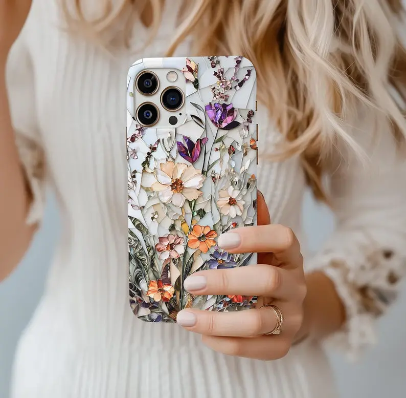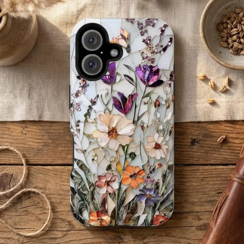 Wildflower Mosaic Phone Case Botanical Floral Print Tough Case for iPhone Samsung Polycarbonate TPU Impact Resistant Shock Dispersion Glossy Finish with Wireless Charging Support