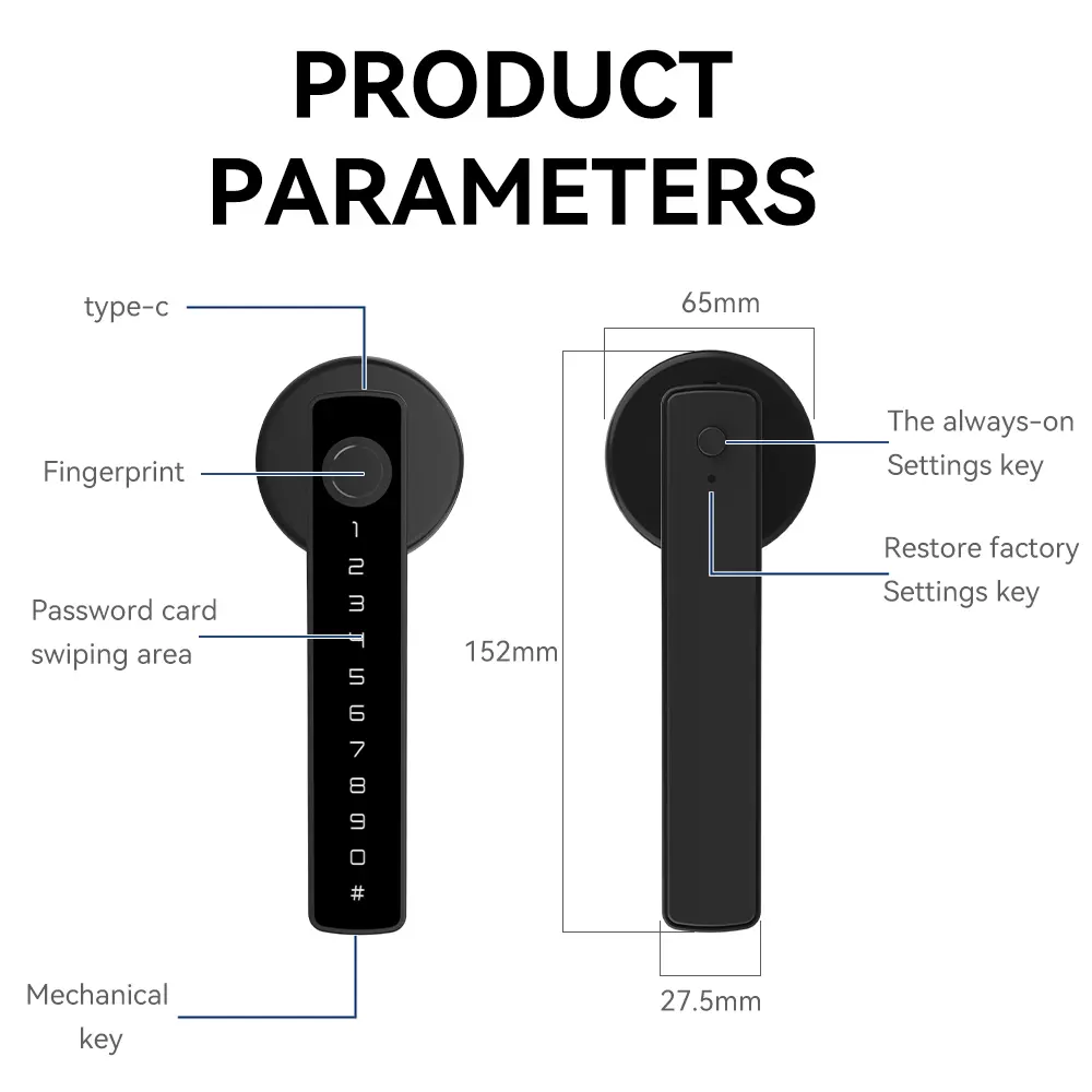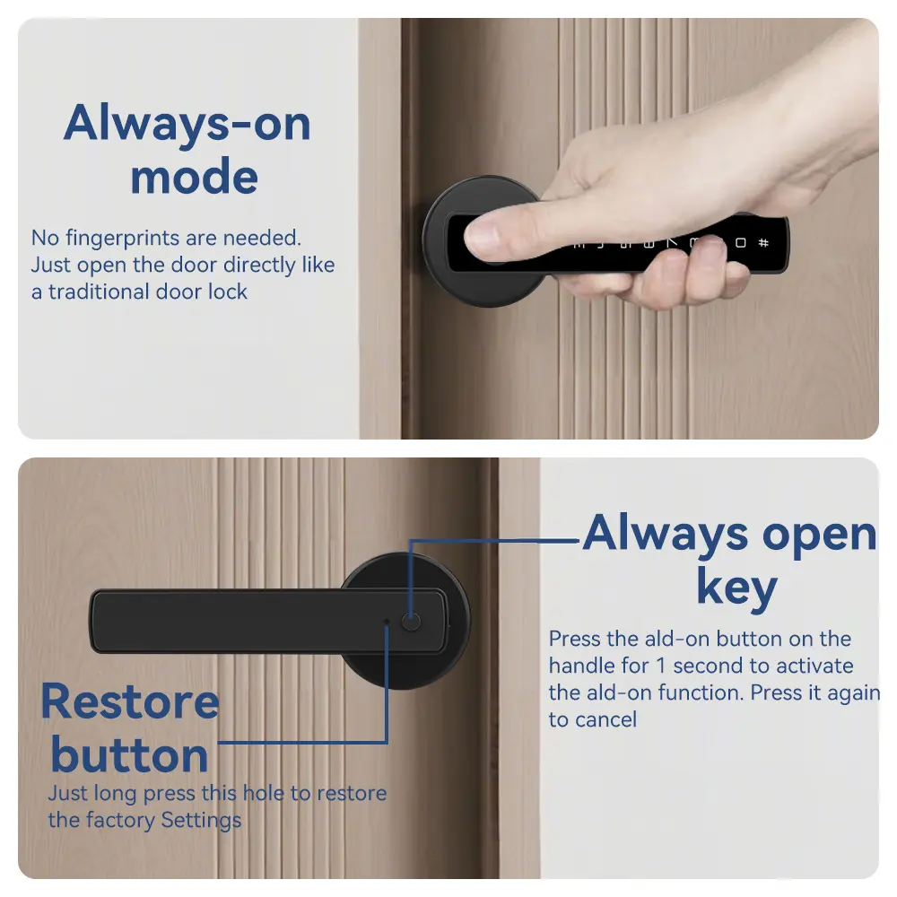 ·Always-On Mode: No need for fingerprint/password—open the door directly like a traditional lock (press the handle button to activate/cancel)
