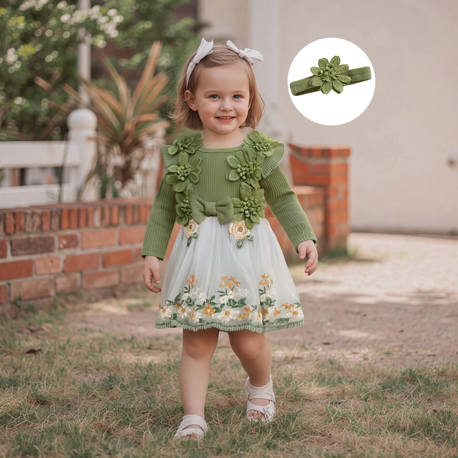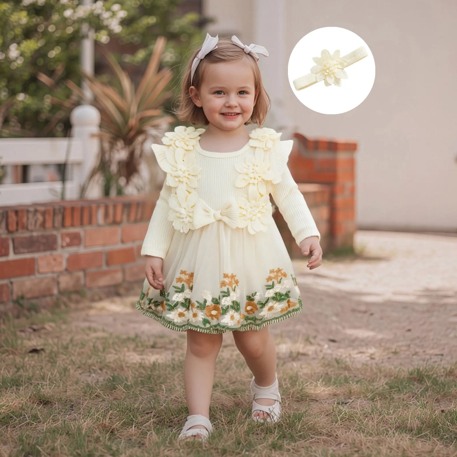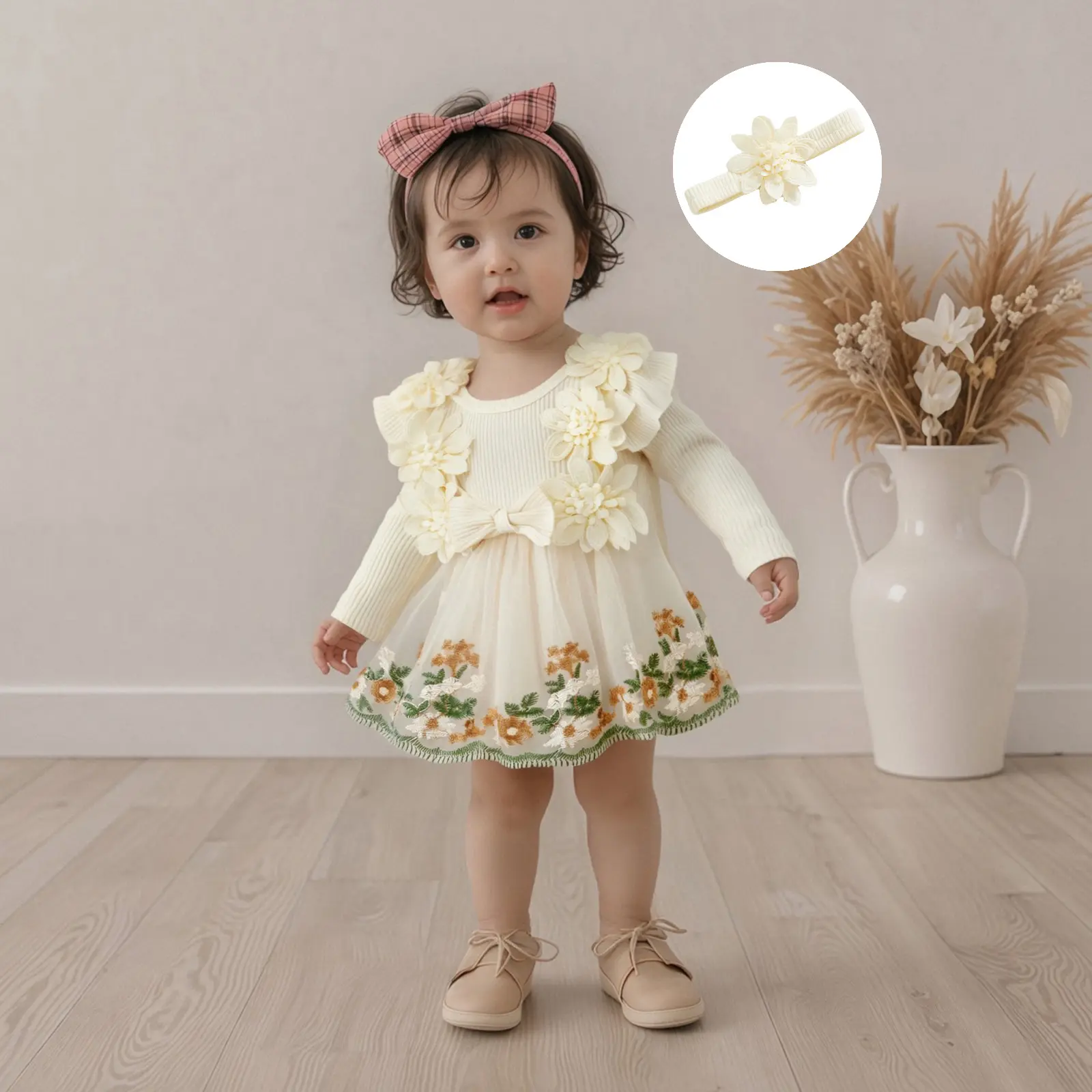 Baby Girls 2Pcs Fall Outfits Long Sleeve Flower Embroidery Tulle Skirt Romper with Headband Set Newborn Clothes