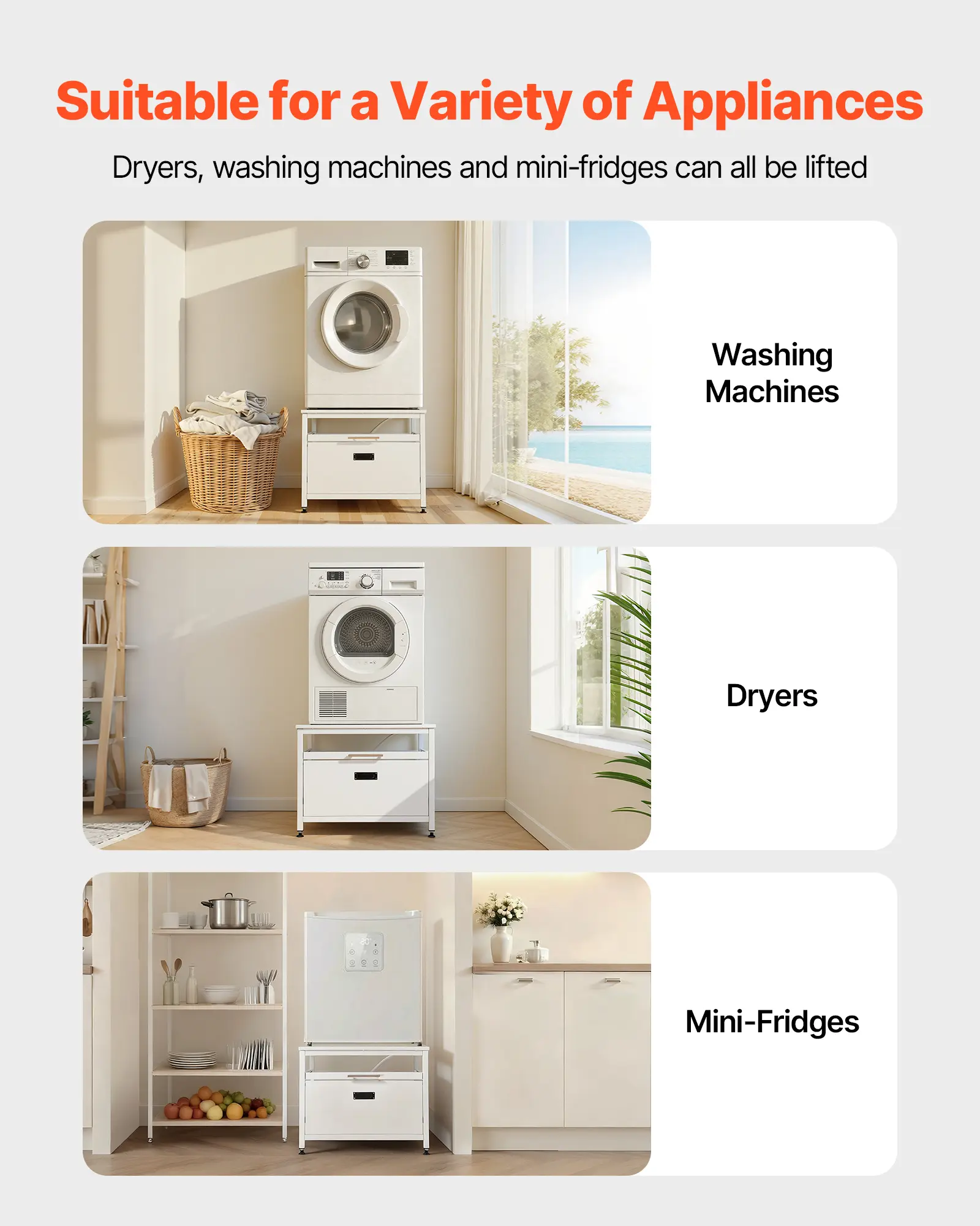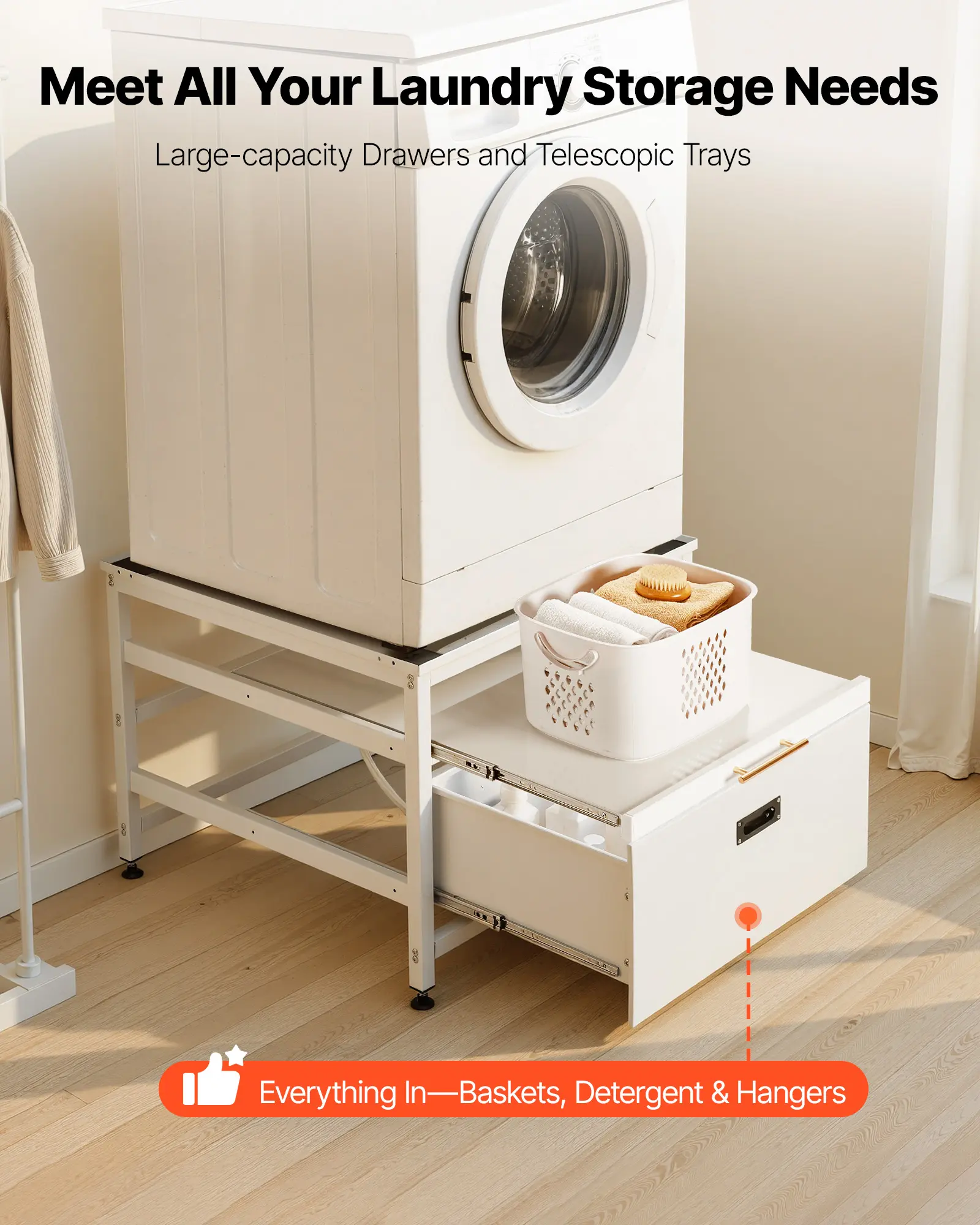 Smart Storage & Stable Design: This dryer pedestal features one spacious drawer and a pull-out tray to keep laundry supplies neatly organized. It helps reduce clutter in your laundry area and improves overall space utilization for more efficient setup