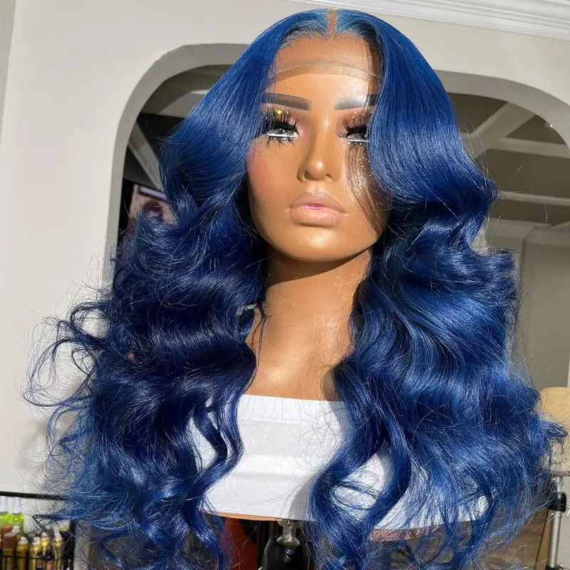 2026 Wig with middle parting, blue large wavy long curly hair, rose net cap